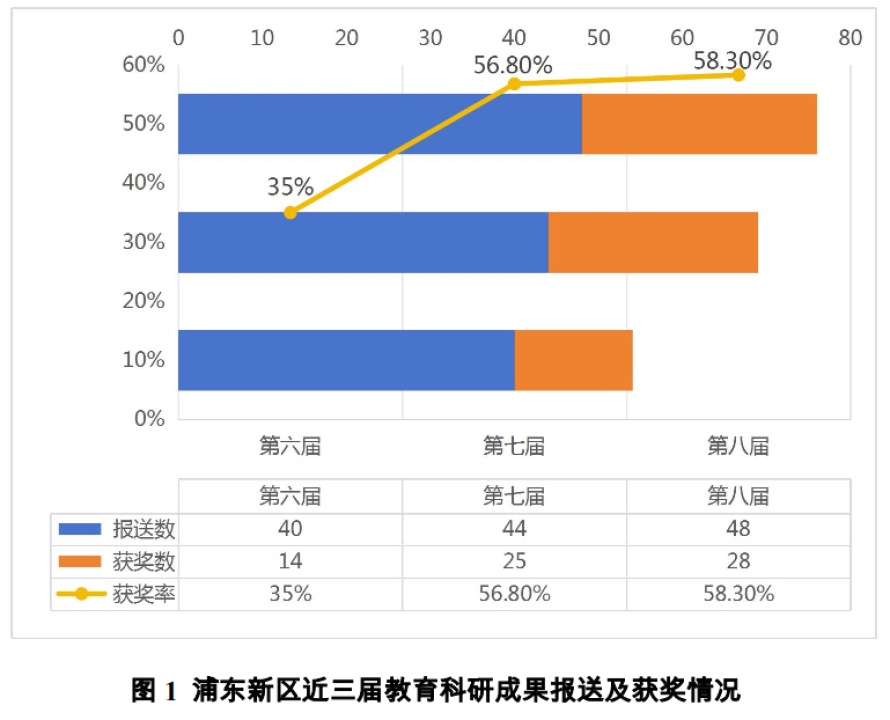 上海市教育科研成果奖自2002年创设以来已举办八届,直接惠及数千教师及其团队。第六届获奖率35%、第七届飙升至56.8%,再到第八届获奖率58.3%再创新高,浦东教科研成果的获奖数量从14项翻倍到28项,同时获奖比例的不断突破提升。其背后,正是浦东搭建科研立交桥,以科研引领区域教育高质量发展的创新探索,以及行之有效的“行动式支持”。