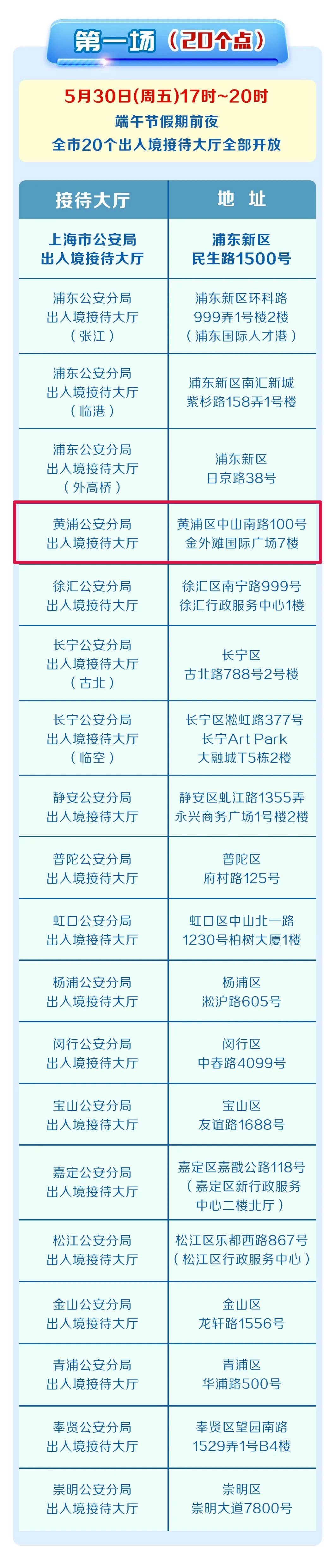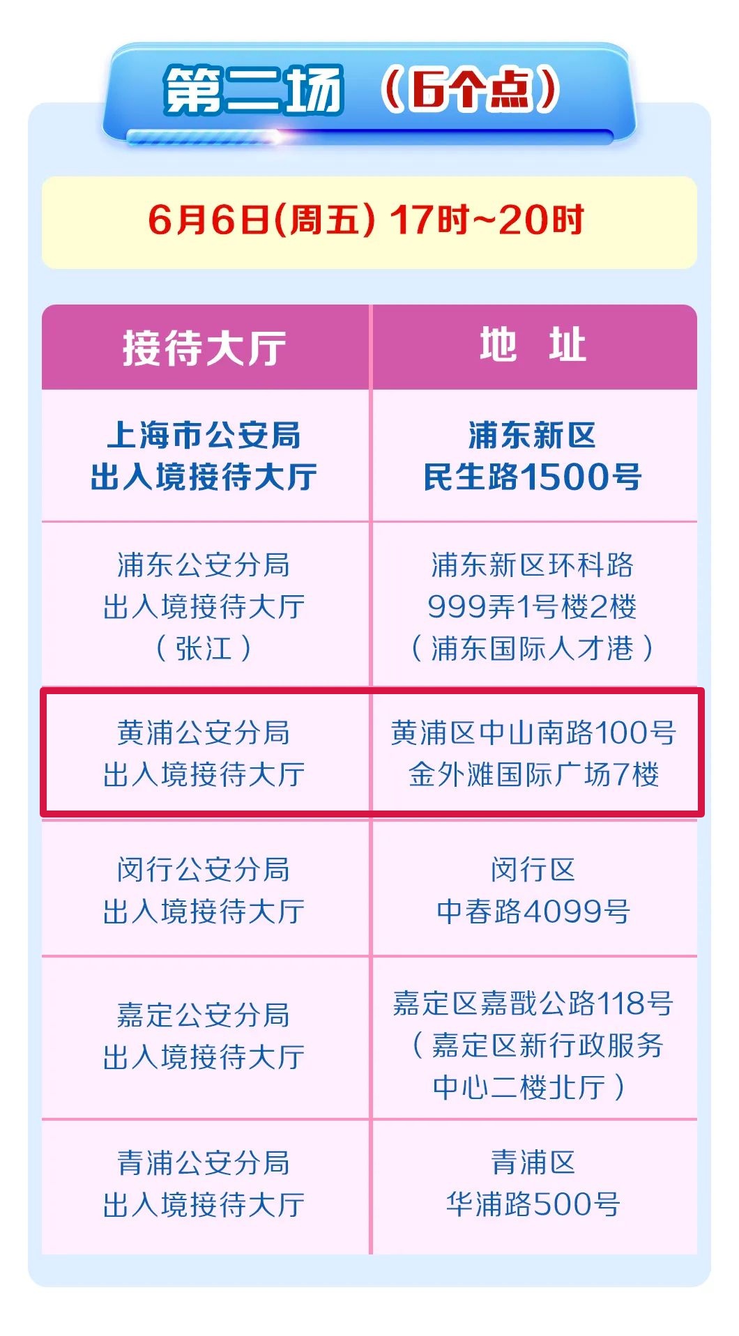 5月30日,6月6日连续两个周五17时至20时,黄浦公安分局出入境接待大厅对外开放,具体信息详见↓↓↓