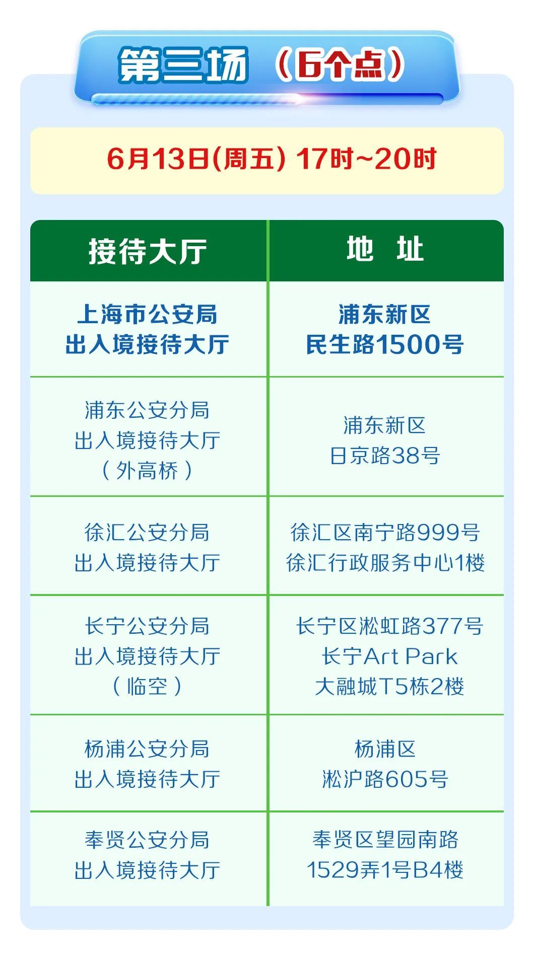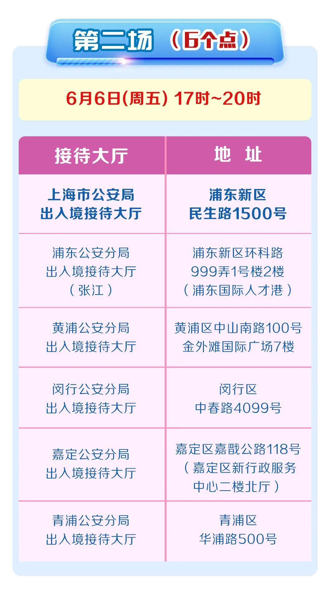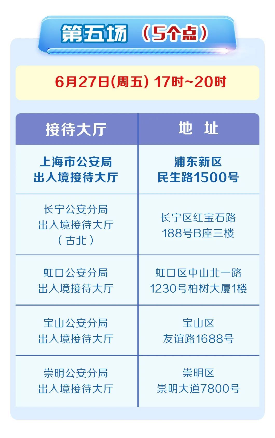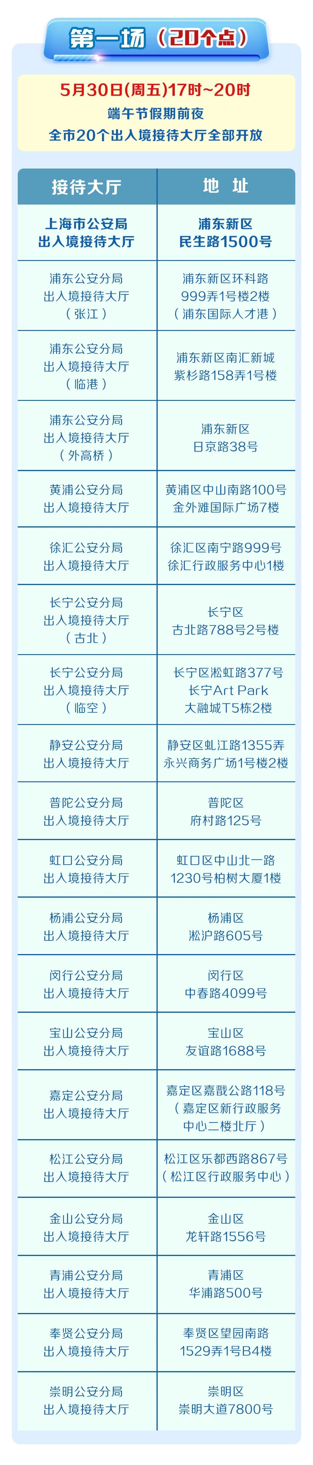 5月30日,6月6日、13日、20日、27日连续五个周五17时至20时,全部或部分出入境接待大厅对外开放。详见↓