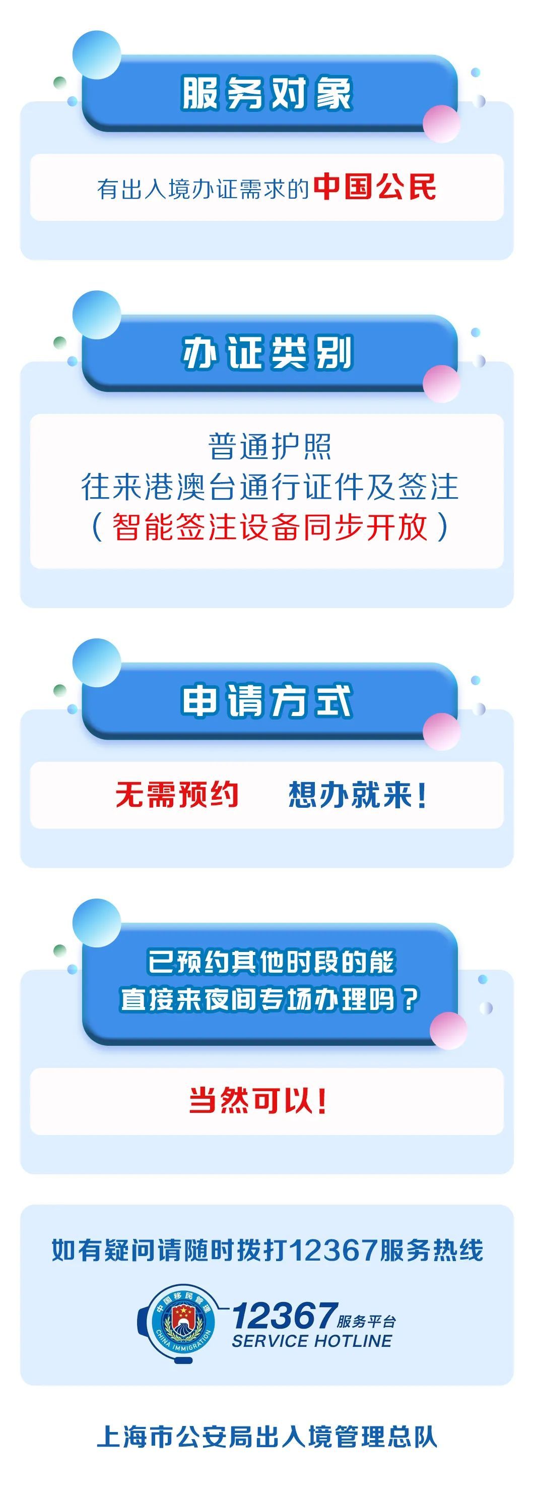 市公安局出入境管理总队介绍,为便利广大市民暑期出境游提前办妥出入境证件,满足在沪学生、企业员工等非工作日时间办证需求,更好服务助力企业“走出去”,上海公安出入境管理部门将连续第三年加开出入境办证夜间专场。