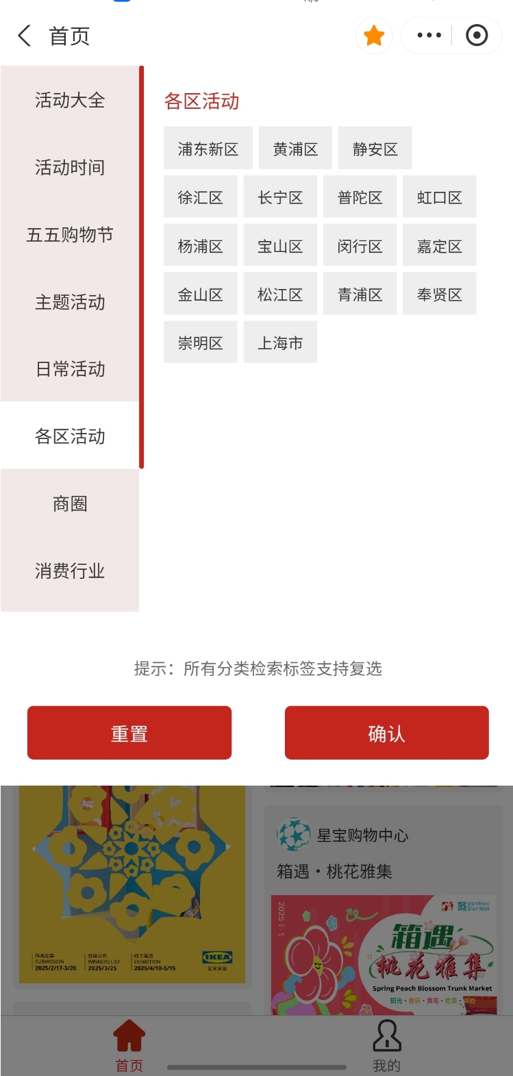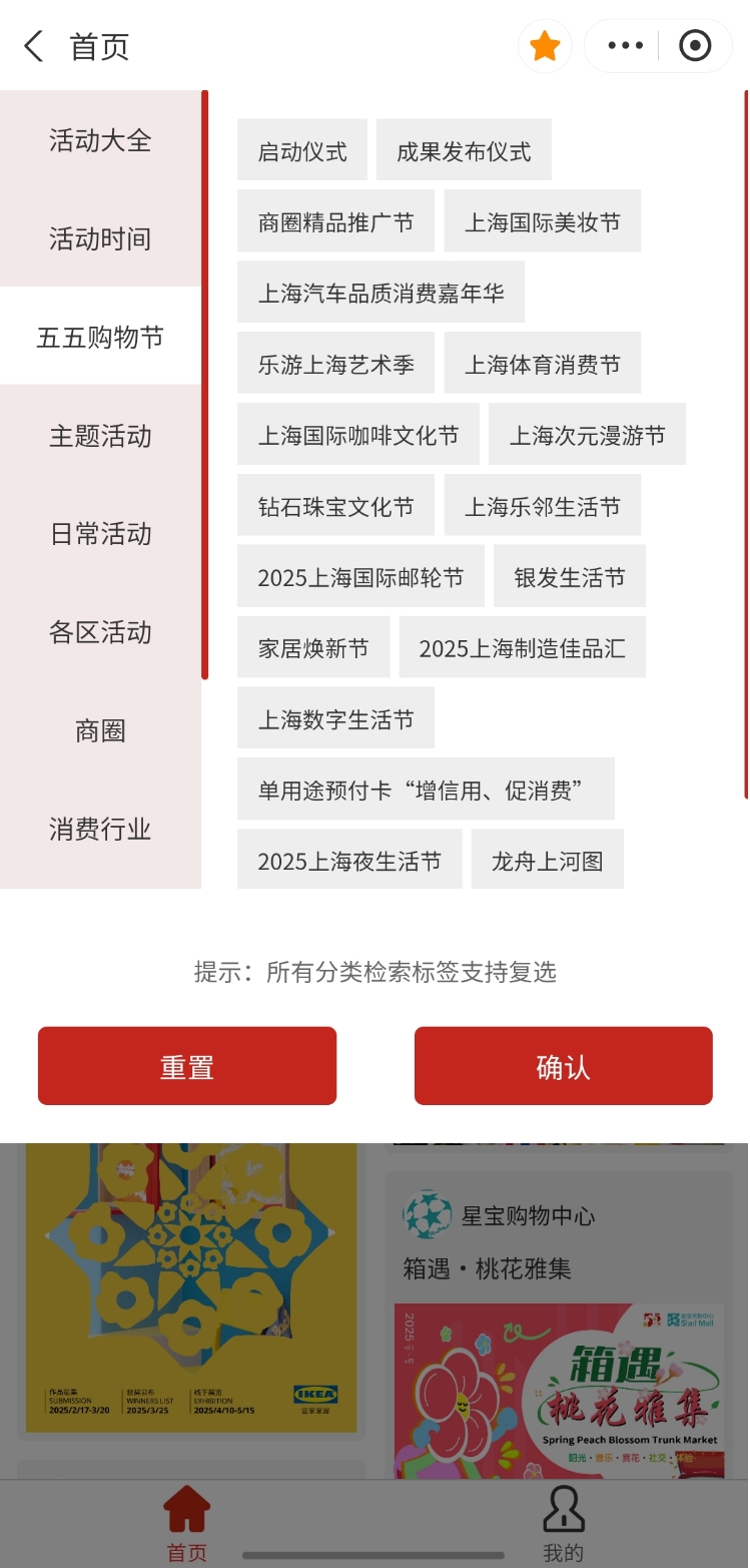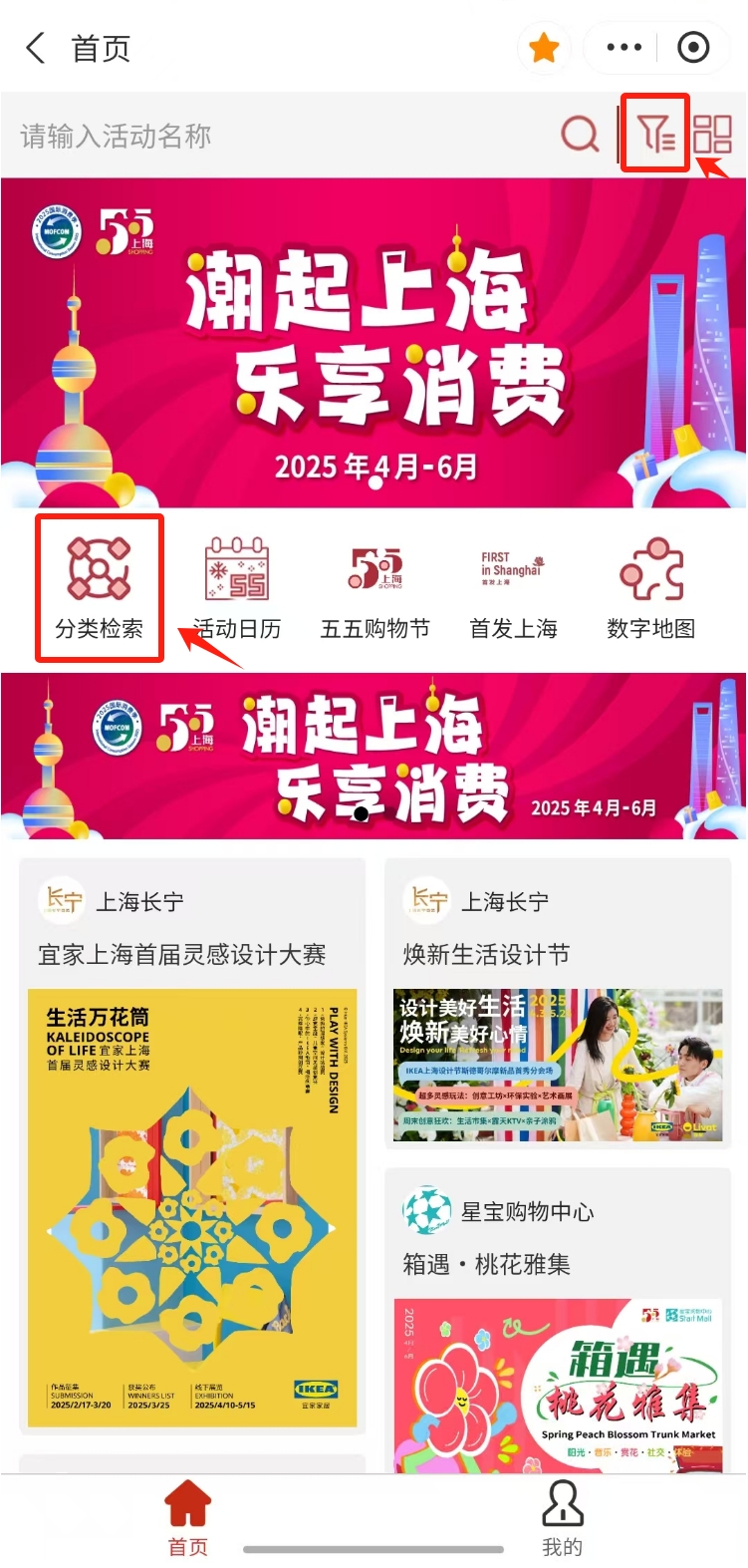 点击进入或点击右上角“筛选”按钮,即可按照活动时间、活动主题、活动类别、行政区域、临近商圈、消费行业等标签进行筛选,一键查找你感兴趣的活动。