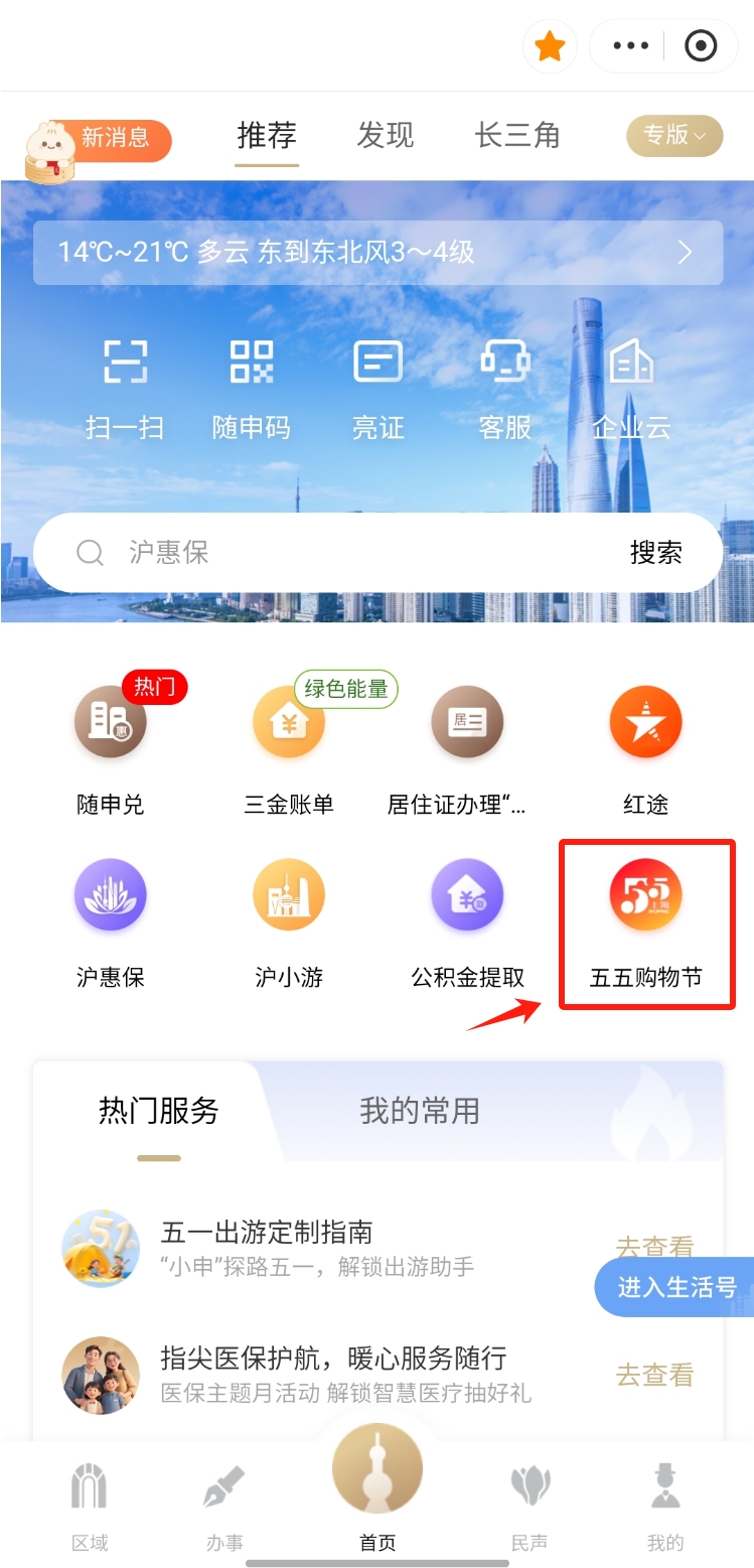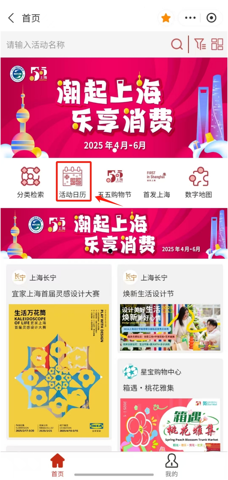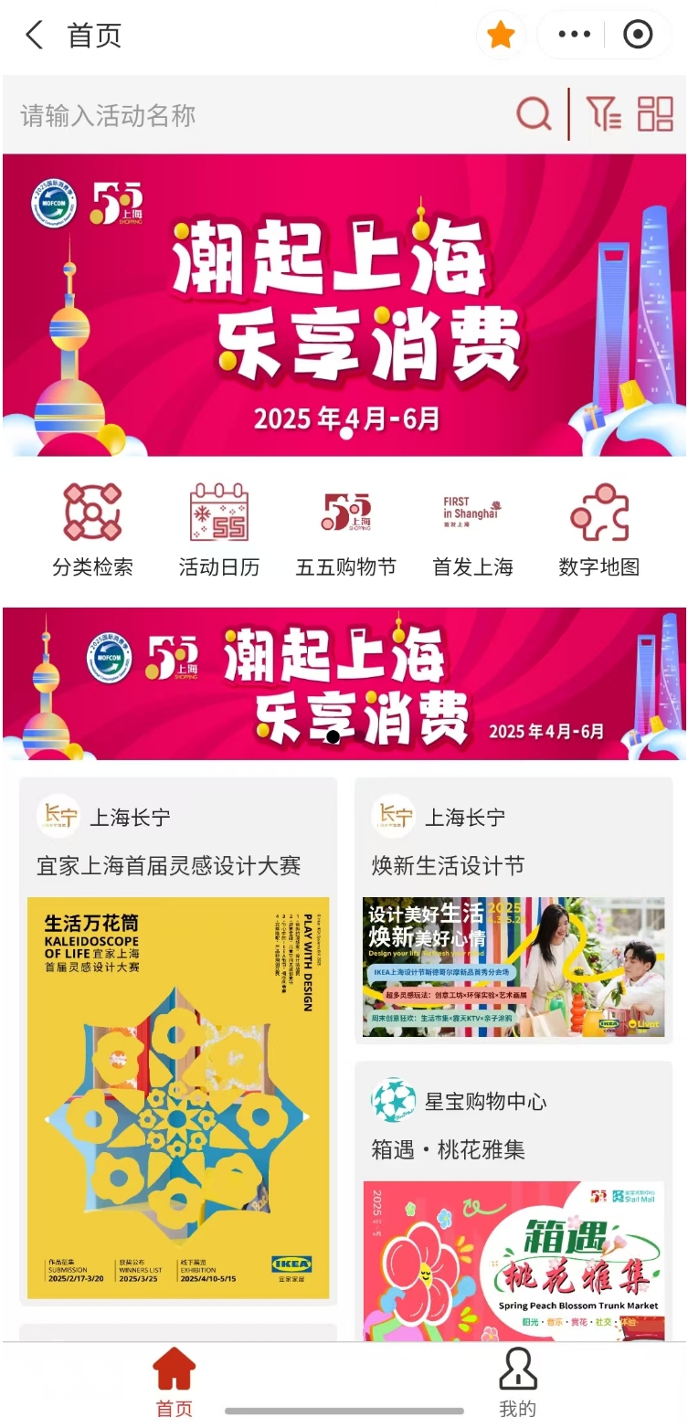 打开“随申办市民云”(APP/微信小程序/支付宝小程序),首页点击“五五购物节”,即可通过活动排片表快速查询全市重点商圈、购物中心、商场超市正在举行的相关活动!