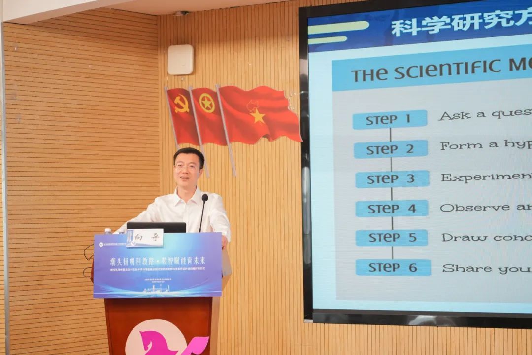 学校教师科学素养提升培训班同时开班。上海交通大学终身教育学院党委副书记、纪委书记白杰和向导院长共同向教师科学素养提升培训班学员代表赠送交大校徽,标志着双方正式开启科学教育合作新征程。