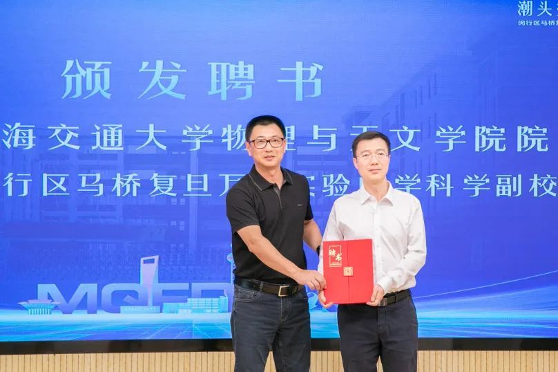 马桥复旦万科实验中学党支部书记、校长王治华为向导教授授予科学副校长聘书。向导教授还是国家杰出青年基金获得者、 教育部高等学校科学研究青年科学奖获得者、腾讯科学探索奖获得者、美国物理学会会士。