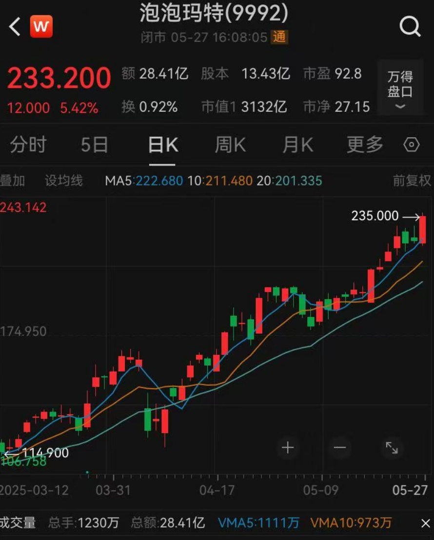 今年以来,泡泡玛特实现了海外市场的爆发式增长以及股价上的一路飙升。5月27日,泡泡玛特大涨5.42%,股价再创历史新高,每股报233.2港元,总市值3132亿港元,今年股价已上涨160%。