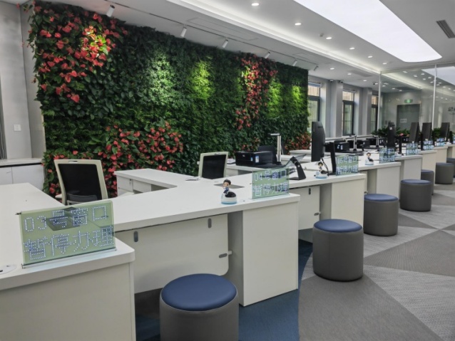 功能升级,聚焦需求暖民心。改造后的新服务大厅宽敞明亮,布局科学合理,精心设置了综合服务区、自助服务区、业务洽谈等六大功能区,全方位满足对外服务需求。在大厅入口处地面,创新性地设置了指示投影灯,为办事群众提供了清晰的指引,让他们能迅速定位服务所在功能区,极大地提升了办事效率。此外,大厅内清新碧绿的绿植墙让人眼前一亮,全新的等候休息区配备了柔软舒适的沙发、椅凳,以及智能插座、饮用机等设备,为群众营造了温馨、舒适的办事环境,全面提升群众办事体验。