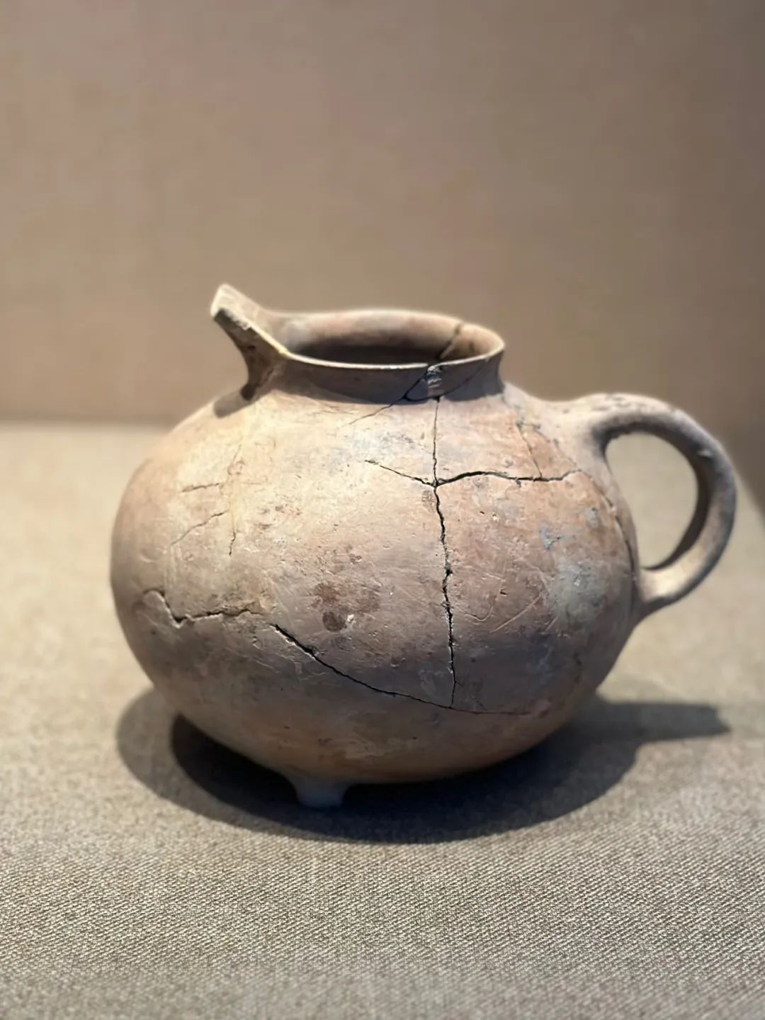 造型别致的“三足陶盉”,作为一件带流宽鋬的“远古水壶”,夹砂红陶胎体上的扁矮足使其稳固站立,仿佛仍能从中嗅到史前先民日常饮食起居的烟火气息。