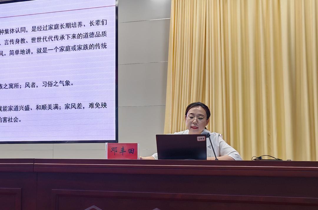 东平县廉政教育中心(县巡察数据中心)巡察数据科科长邓丰田以《以廉洁家风 涵养清风正气》为题进行专题授课。从家风的由来等五个方面进行了精彩讲解。授课内容深入浅出,案例生动具体,既彰显了理论的高度,又融入了丰富的实践经验,参会人员深受示警和教育。
