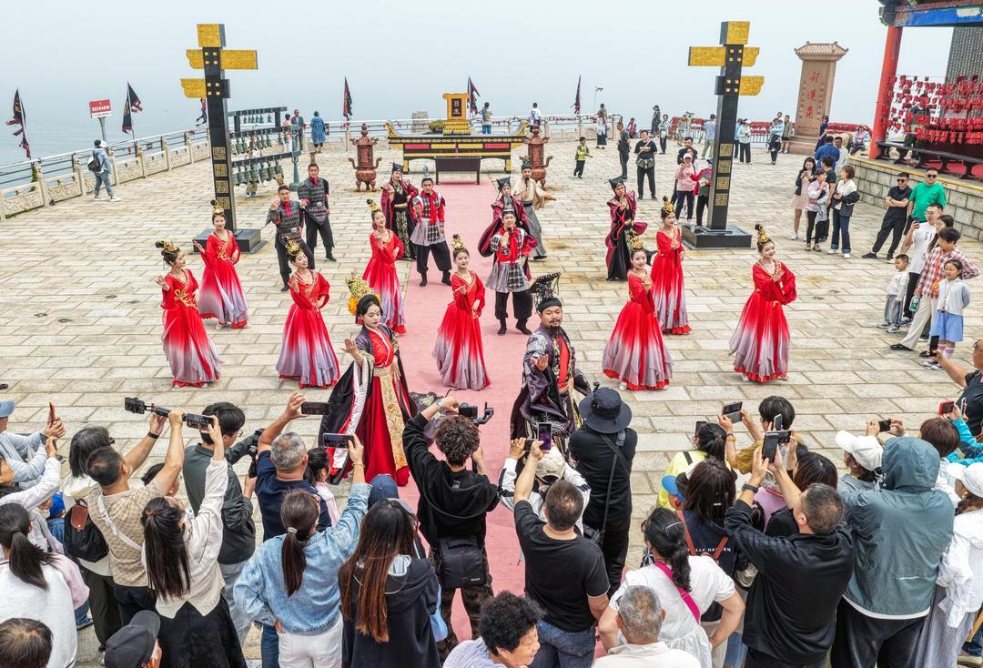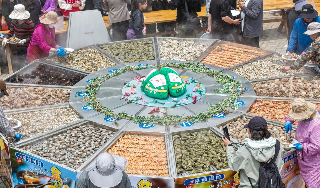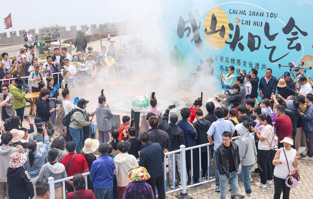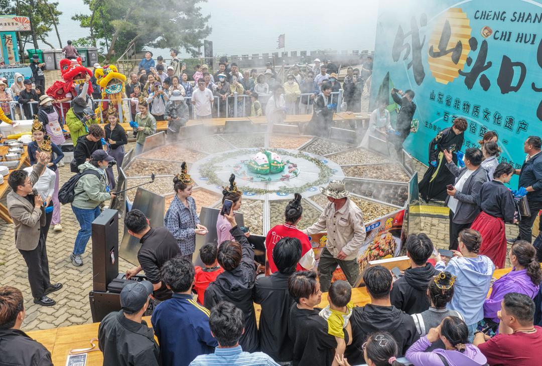 5月31日,荣成成山头风景区迎来大量游客。除了绝美的山海风光和精彩的文艺表演,最吸引游客的莫过于具有浓郁胶东渔家风情的“成山头吃会”——直径6米的渔家海鲜大锅,把新鲜肥美的各类海鲜汇聚一锅,热气腾腾间散发着诱人的鲜香,满足游客的味蕾。