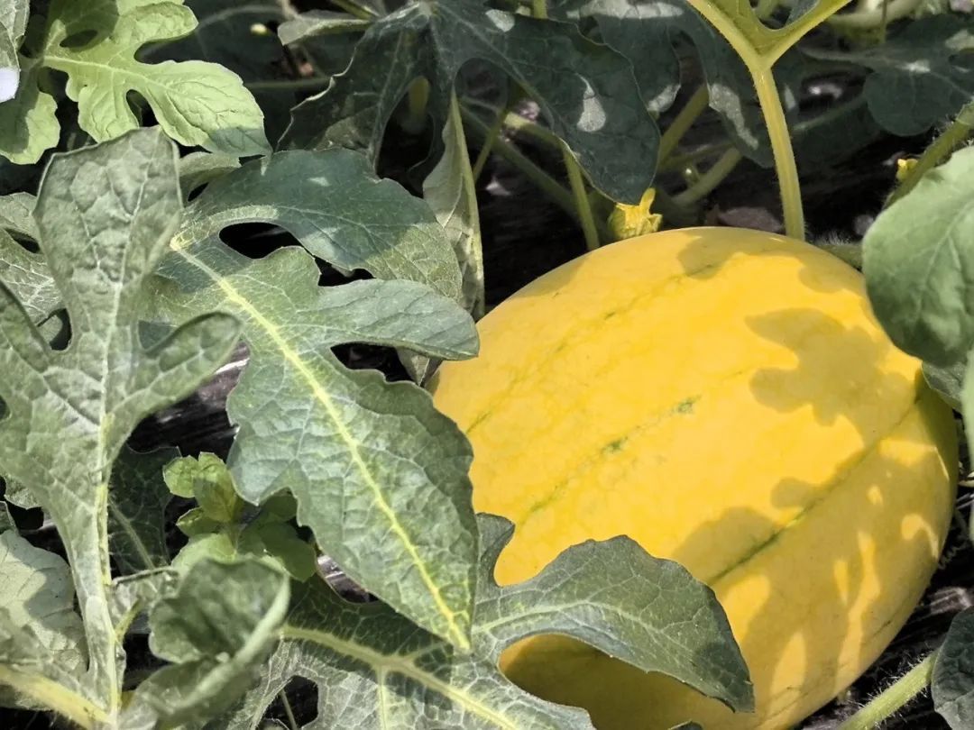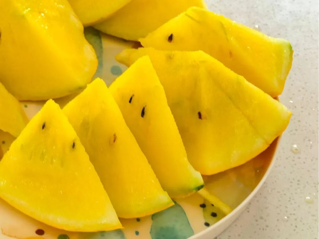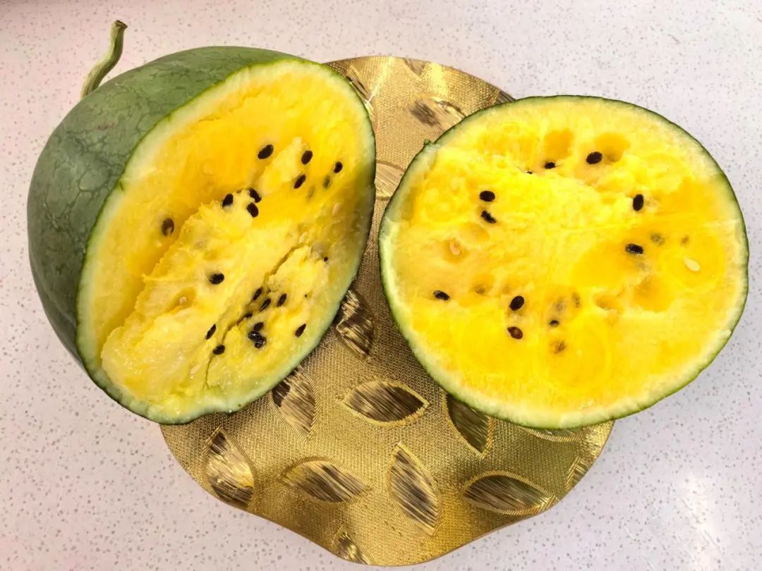 黄晶西瓜产量高、品质优,单瓜重3~4斤,皮薄瓤甜,外观金黄色,果皮覆黄条纹,果肉也是金灿灿的,细嫩鲜甜、汁水丰富、甜度适中。