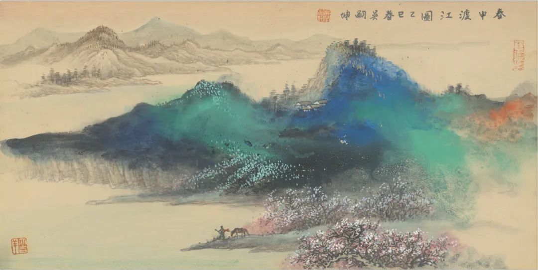 踏入展厅,首先映入眼帘的是张大千的再传弟子——吴嗣坤的“春申渡江”青绿山水国画作品展。在此次展出的作品中,画作《春申渡江图》格外引人注目,它采用矿物质颜料敷色,以细腻的笔触,精心铺陈出浩渺无垠的江面与层峦叠嶂的山脉,宛如一幅天然的锦绣画卷。