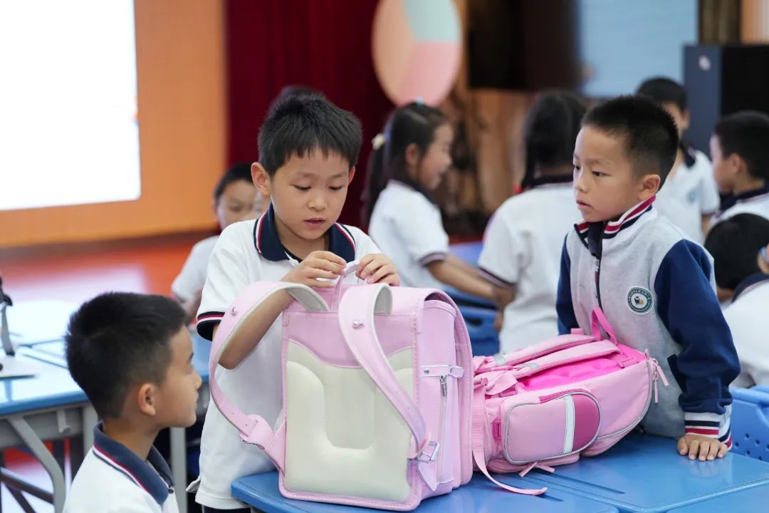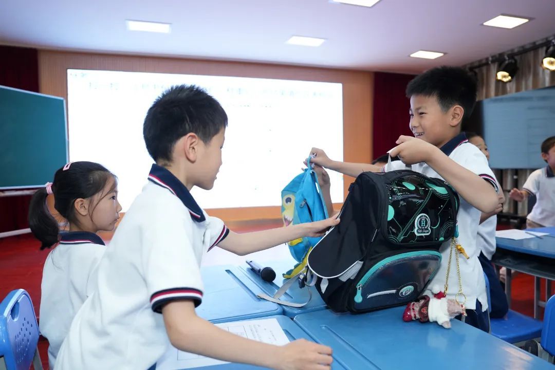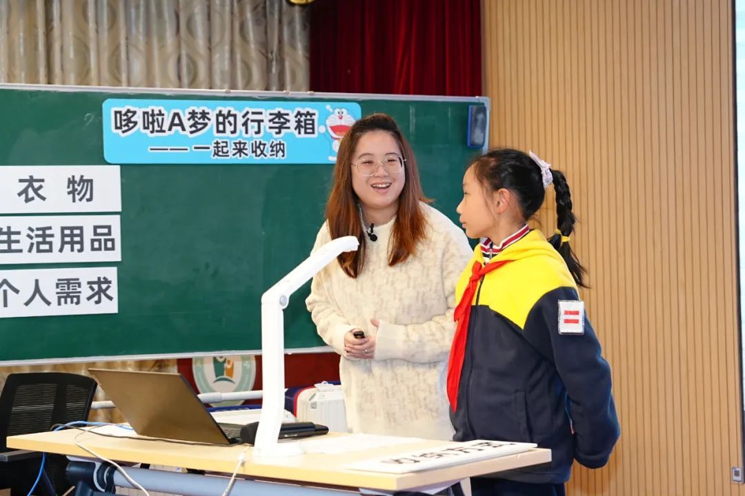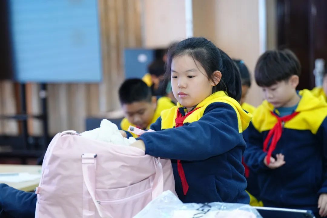 走进二年级的教室,学生正在忙着收拾行李,他们将要前往哈尔滨来一场冰雪之旅,这是学生票选出的人气旅行目的地,学生运用在“哆啦A梦的旅行箱——我是小小收纳师”课程中学到的实用技能,有条不紊地折叠衣物,再整整齐齐地放进旅行箱。授课老师介绍,学生不仅要学习如何折叠收纳衣物,还要学习通过各种渠道搜集、梳理实用信息,自己制作整理小窍门手卡。