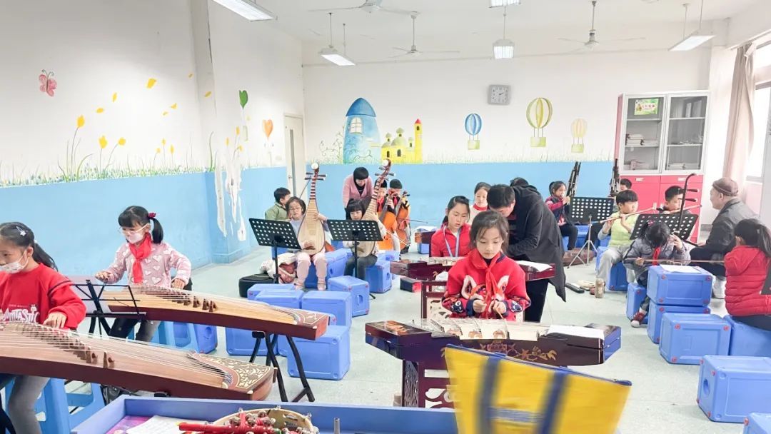镇级“非遗进社区·江南丝竹交流展演”“中外齐聚 乐享中国节”“城市美育日”,区级“非遗日”主题展演……今年以来,徐泾江南丝竹团队的身影活跃在各级文化舞台。他们不仅致力于原汁原味的传承,更勇于探索古韵新声,通过演绎《春晖曲》《苏堤漫步》等融合现代音乐元素的曲目,让传统艺术焕发时代光彩;也邀请年轻乐手共创,在发扬江南丝竹清新典雅特质的同时,增强舞台表现力和时代适应性。尤为关键的是,徐泾镇江南丝竹的“接力棒”传递到了年轻一代手中。2020年至今,徐泾镇江南丝竹乐队坚持每周在徐泾第一小学开设公益课程,由乐队老师悉心教授琵琶、古筝、二胡、竹笛、扬琴、笙等乐器。丝竹雅韵在校园里悠扬回荡,为非遗的未来播下了希望的种子。