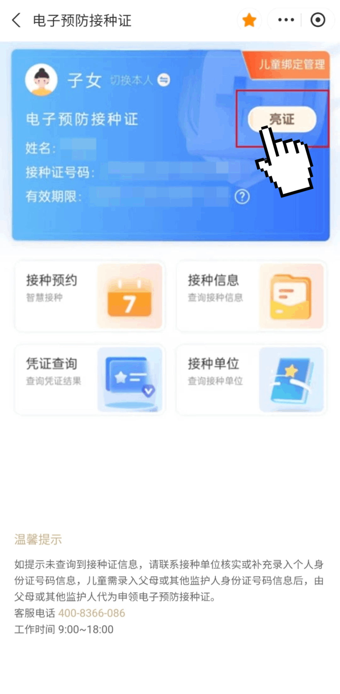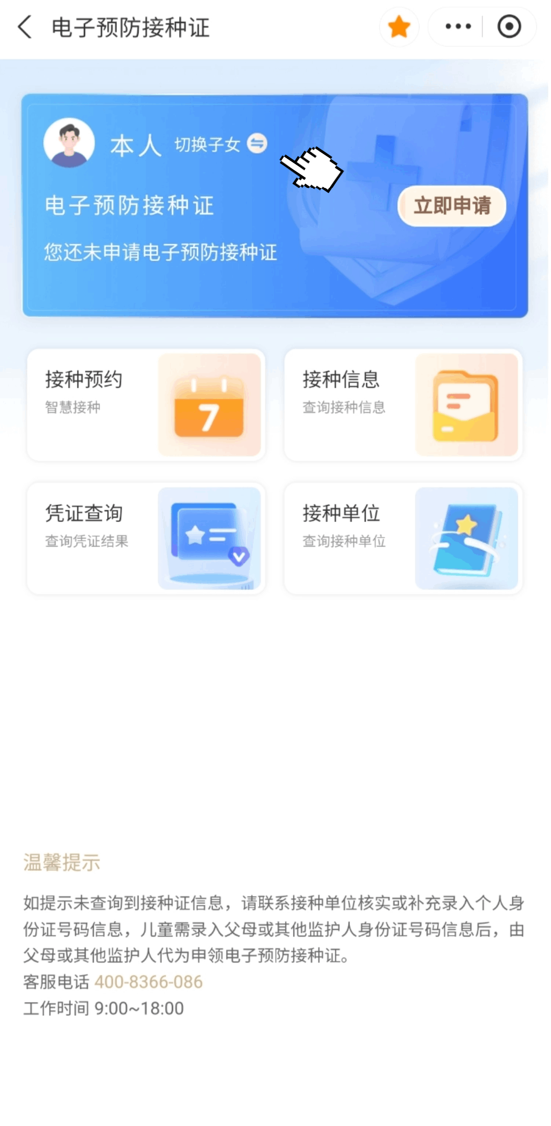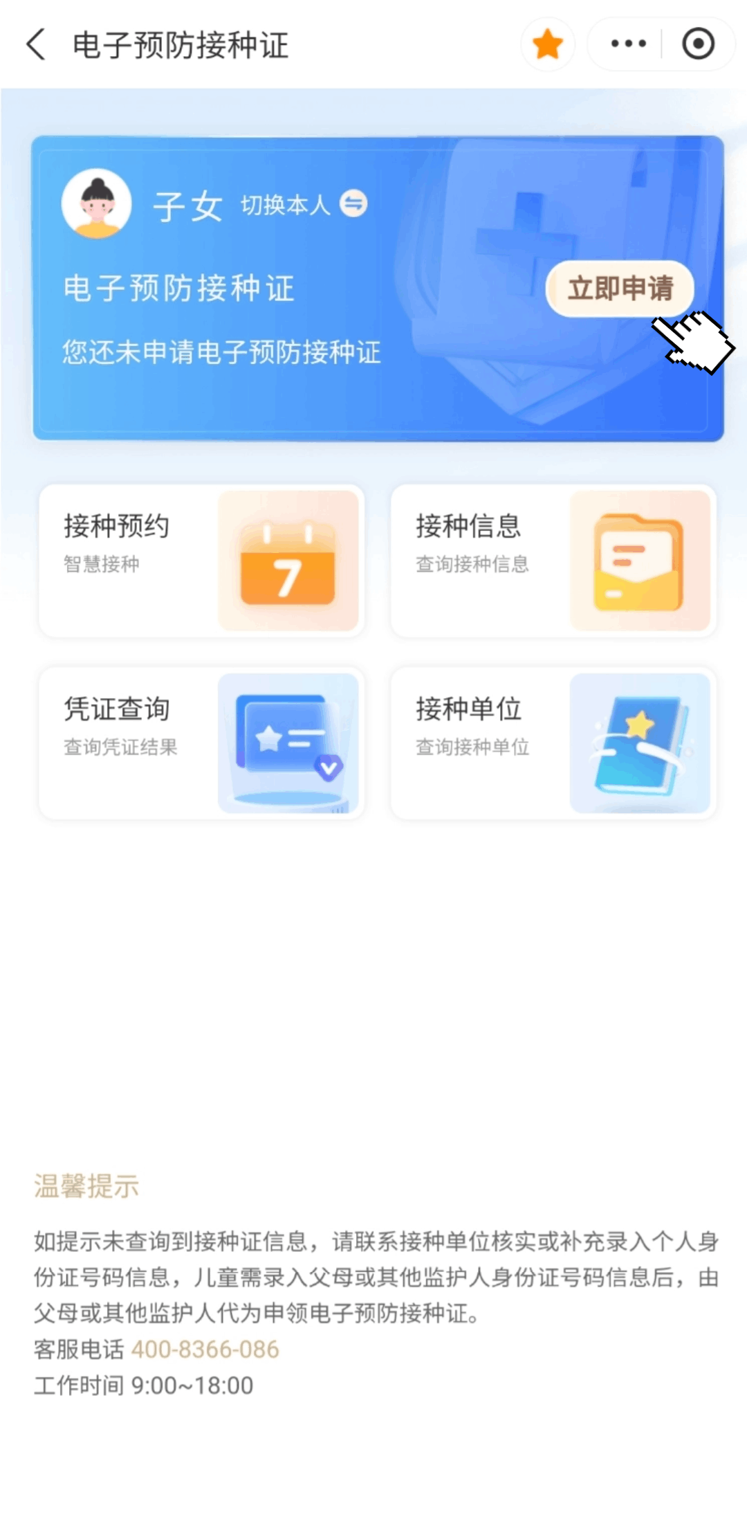 市民在申领和使用电子预防接种证过程中需要帮助可以拨打电话400—8366086(9:00-18:00)进行咨询。