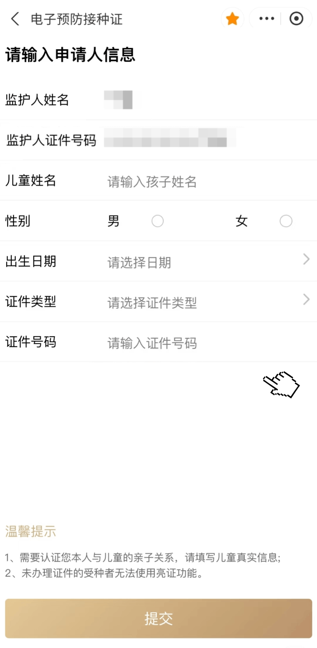 家长可在电子预防接种证申领儿童接种证页面,证件类型选择为“其他(预防接种证条形码)”,输入被申领人(儿童)纸质预防接种证条形码为其申领电子预防接种证。