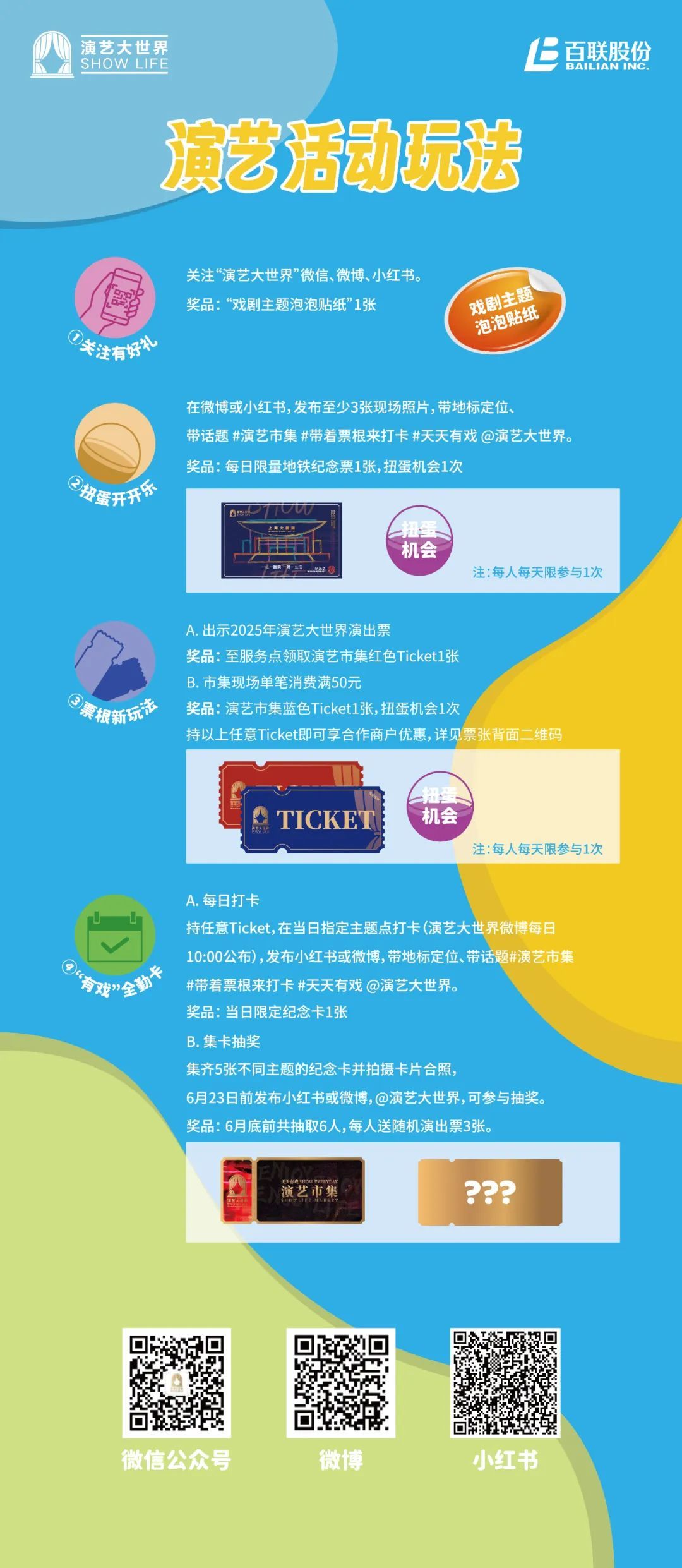 除了演出折扣,各摊位更有限定周边发售,并开放主题人生四格、幸运转盘等丰富玩法。演艺大世界也推出“剧场锦鲤池”等五大福利活动,高中奖率让现场反响热烈,参与者们纷纷拍照晒出惊喜收获的限量纪念票、周边、演出票等奖品。