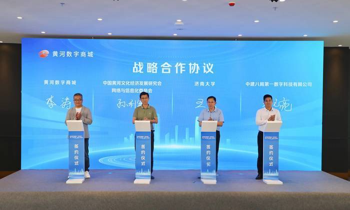 活动中,黄河数字商城与中国黄河文化经济发展研究会、济南大学、中国中丝集团有限公司、中建八局第一数字科技有限公司现场达成并签订战略合作协议;省、市、区领导依次上台为黄河数字商城揭牌,同步揭幕新零售智能终端“神秘面纱”,并为“第一书记优选”“天桥优品”两大品牌启动上线。