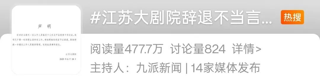 6月18日,江苏大剧院运营管理有限公司官方微博发布声明:针对近日我司一名工作人员在其个人社交平台发表不当言论,我司已于第一时间停止其所有工作,并按照相关规定予以辞退。剧院将进一步强化工作人员教育管理,杜绝此类事件发生。