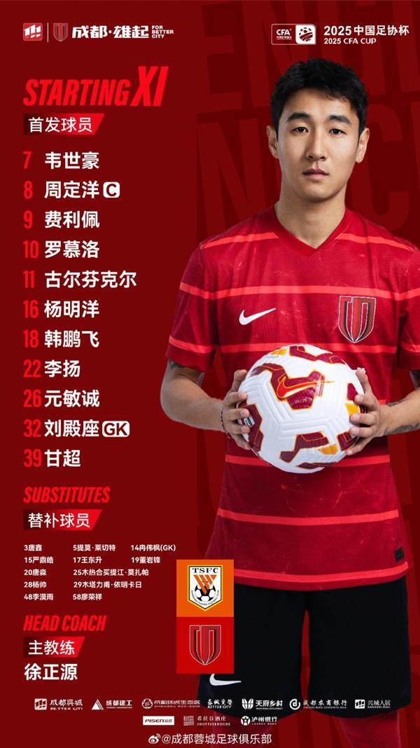 去年成都蓉城饮恨足协杯决赛,对手正是泰山。今年徐正源率领球队已经完成了在联赛中对泰山的复仇,这次当然是想在杯赛当中再次复仇。本场蓉城同样派出三外援,费利佩、罗慕洛、古尔芬克尔先发,刚刚伤愈的莱切特替补,韦世豪、周定洋、杨明洋出战,胡荷韬伤缺。
