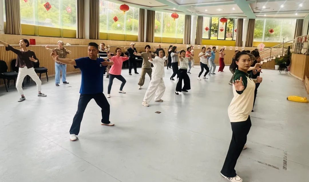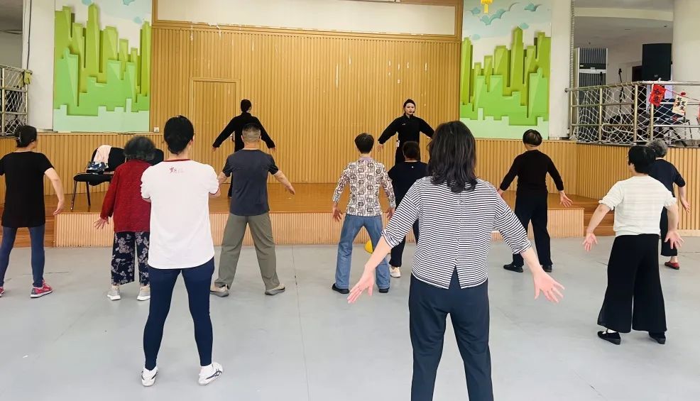 随后,居民们跟随引导,凝神静气,跟随口令缓缓起势,全神贯注地模仿每一个细节——沉肩、坠肘、松腰、坐胯。一边学习,李美莎一边耐心纠正居民们的姿势,确保大家“听得懂、学得会、做得对”。操练数遍后,大家的动作从生疏渐趋流畅,活动现场弥漫着专注而和谐的韵律。