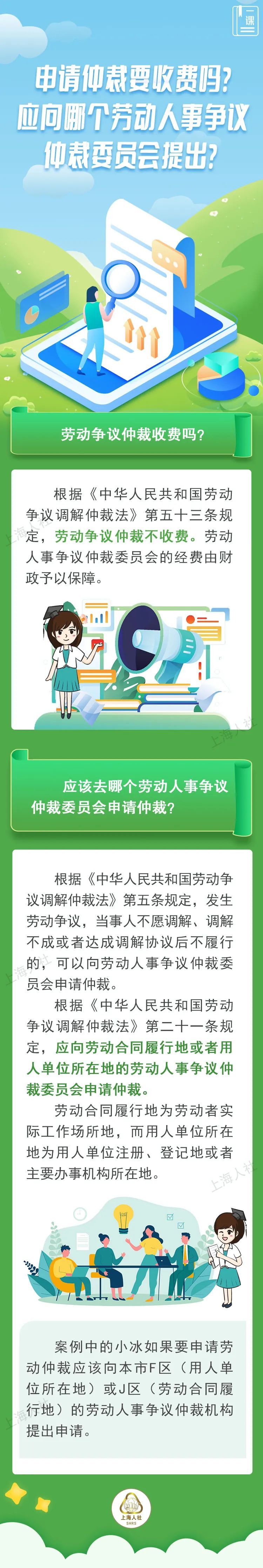小冰5月从注册在本市F区的一家化妆品公司离职,公司办公点在本市J区。离职时,单位表示将在次月把今年小冰的加班工资结算给他。但过了近两个月,小冰仍然未收到加班工资,经协商和调解都未解决此事,于是她决定申请劳动仲裁。那么,申请仲裁要收费吗?应向哪个区的劳动人事争议仲裁委员会提出仲裁呢?是F区还是J区呢?