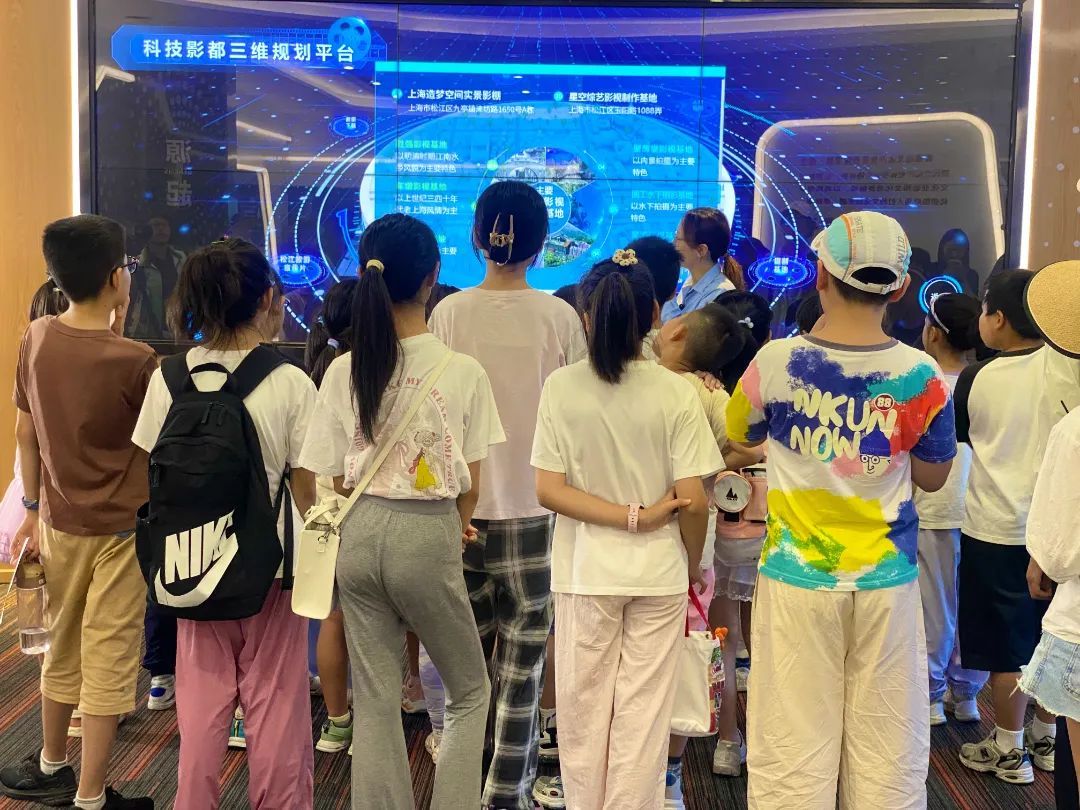 7月15日下午,由“松茸成长营”推出的暑期研学活动第五站行至上海科技影都规划展示厅。来自区内中小学42名“小松茸”沉浸式体验松江影视产业的蓬勃生态与前沿科技。
