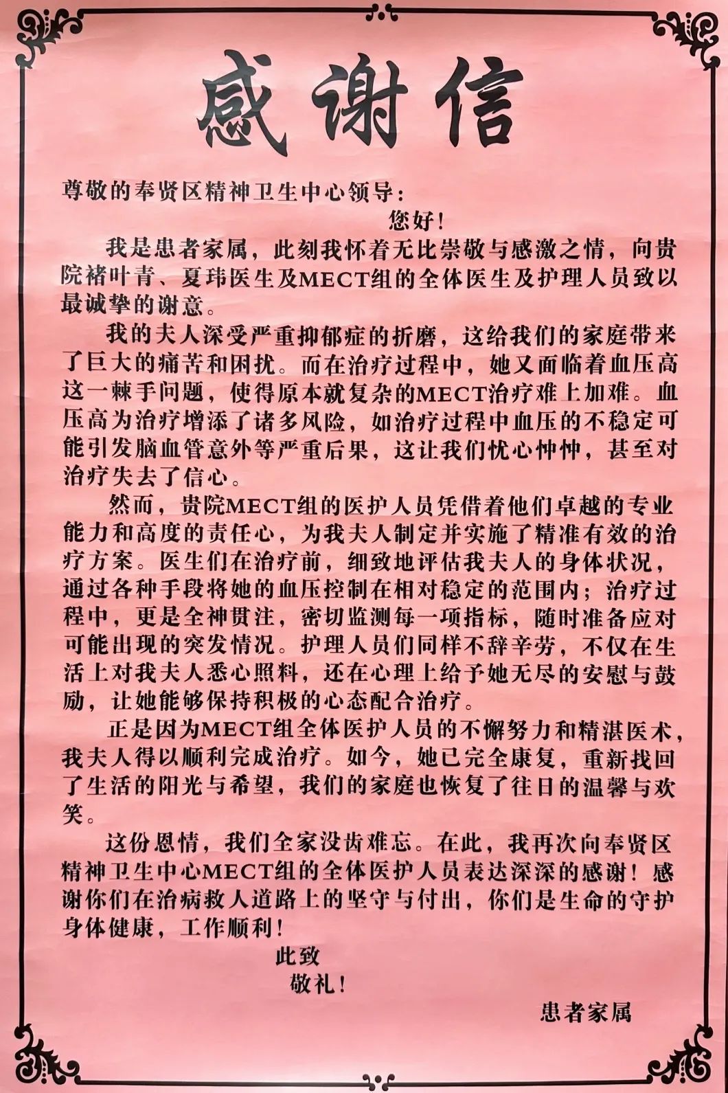 “正是因为MECT组全体医护人员的不懈努力和精湛医术,我夫人得以顺利完成治疗。如今,她已完全康复,重新找回了生活的阳光与希望,我们的家庭也恢复了往日的温馨与欢笑。”