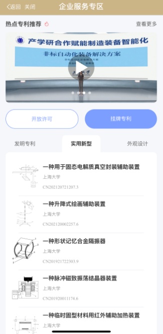 “专利超市”接入“随申办”市民云宝山旗舰店后,企业通过手机端即可便捷浏览涵盖智能制造、电子信息、新材料等多个领域的专利资源库。超市依托AI视频化专利介绍技术,系统全面地展示专利技术的研发背景、技术细节及应用场景。目前移动端专利资源库已上线开放许可的专利信息97项,挂牌专利千余项,覆盖发明专利、实用新型专利、外观设计专利全类型。每项专利均规范罗列基本信息,专利概况、专利分类和交易信息,为有需要的企业和高校院所提供线上对接的便捷服务,构建“技术可视、服务可及、交易可控”的知识产权掌上服务新模式。