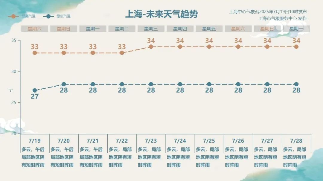 申城今天(7月19日)以多云为主,午后局部地区有短时阵雨。东南风3~4级,中午起风力加大至4~5级阵风6级,沿江沿海地区5级阵风6~7级。气温在27~33℃之间,相对湿度90%~60%。