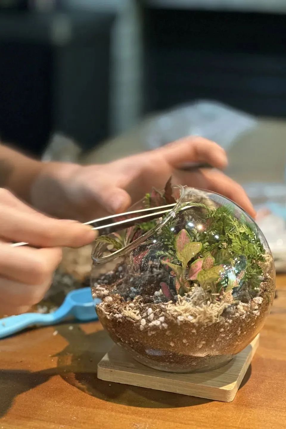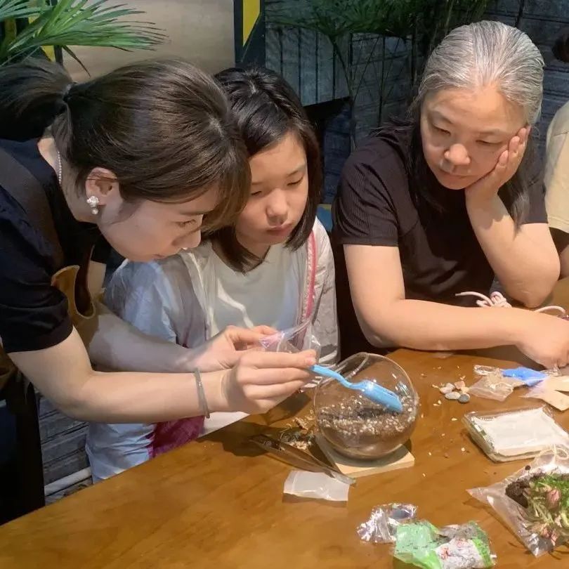 活动中,园艺师一步步示范微景观制作流程,并向大家介绍常见植物的养护知识。从摆底石、水苔到营养土的分层铺设,从选择苔藓、网纹草到砂石、装饰物的搭配,居民们化身“园艺设计师”,在透明的玻璃器皿中发挥创意,小心翼翼地栽种和布局。