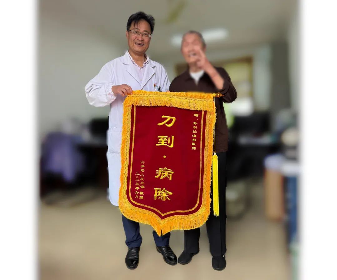 近日,青村镇社区卫生服务中心外科医生杜海彬收到了一面特殊的锦旗。这面来自99岁高龄患者王伯伯的锦旗上,“刀到病除”四个大字格外亮眼,字短情长,饱含着老人沉甸甸的感激之情,更是对医务人员医疗技术的肯定。