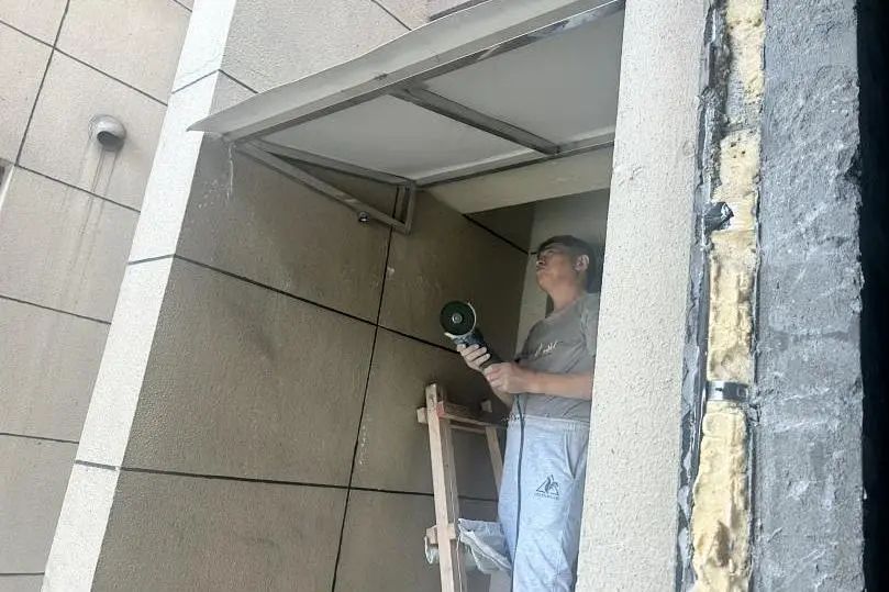 通过初步检查,工作人员发现目前房间内正处于装修的初期阶段,相关管道、线路设施尚未完成铺设,墙面与地面也只是做了简单的基础维护且没有违规破拆埋管的迹象。从客厅处深入外侧房间细致搜索发现,在靠近楼栋通风井的厕所外平台上方发现一处以不锈钢为框架结构、顶部为塑料板铺盖的防水雨棚已完成临时安装,伴随着高层楼栋迎面的“穿堂风”,该处设施“嘎吱”作响。由于未有相关设计图纸及加装许可,因此根据《中华人民共和国城乡规划法》可认定该雨棚是名副其实的“违章搭建”。