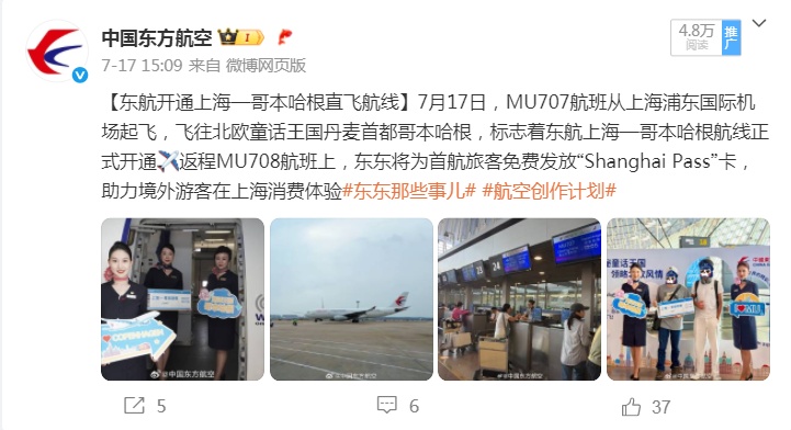 2025年7月17日下午14:09分,东航MU707航班从上海浦东国际机场起飞,搭载234名旅客首航飞往丹麦首都哥本哈根,标志着东航“上海—哥本哈根”航线正式开通。今年正值中丹建交75周年,该条新航线在两国间架起了一条高效便捷的空中通道,将为未来双方扩大交往、加强沟通、深化合作创造良好条件。