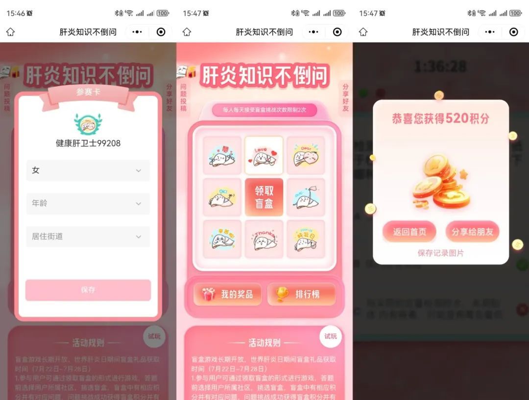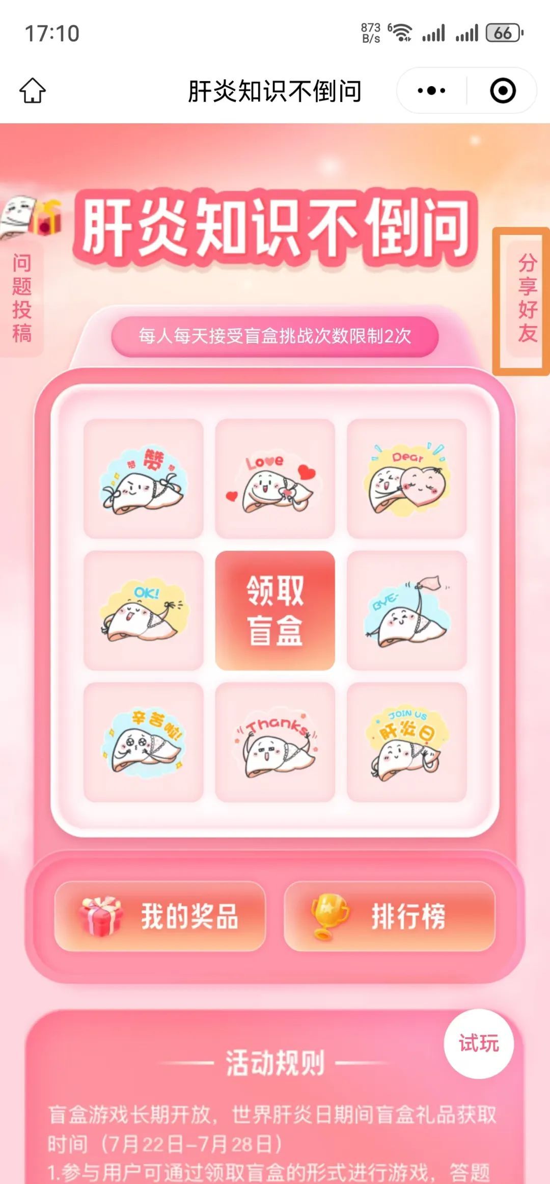 ◆ 世界肝炎日期间盲盒礼包的获取时间为7月22日-7月28日,此后答题游戏长期开放。