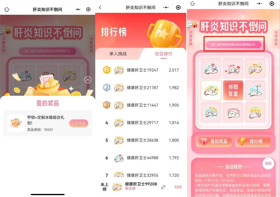 2.用户每日领取盲盒接受挑战次数限制2次,并在每次挑战结束后展示当前答题正确与否、个人积分,同时累积本次答题数据进入排行榜。用户随时可进入小程序查看当前总排名及社区排名,获得盲盒礼品奖励的用户可以在我的奖品页查看。