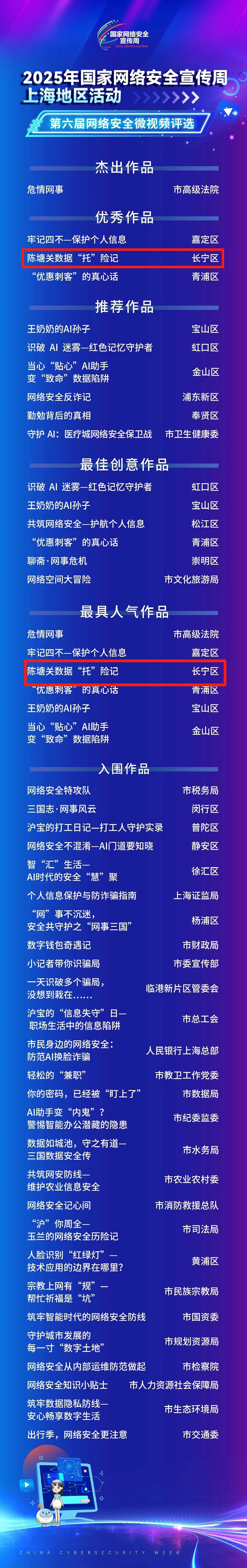 为办好2025年国家网络安全宣传周上海地区活动,进一步提升广大人民群众的网络安全意识,普及网络安全知识,上海市委网信办组织开展了“第六届网络安全微视频”征集评选活动,共收到各区、各单位选送的微视频40部。结合线上投票和线下专家评审,现评选出网络安全微视频杰出作品1件、优秀作品3件、推荐作品6件,最佳创意作品6件,最具人气作品6件,入围作品27件。其中,长宁区选送的作品“陈塘关数据‘托’险记”获评优秀作品和最具人气作品两个奖项。