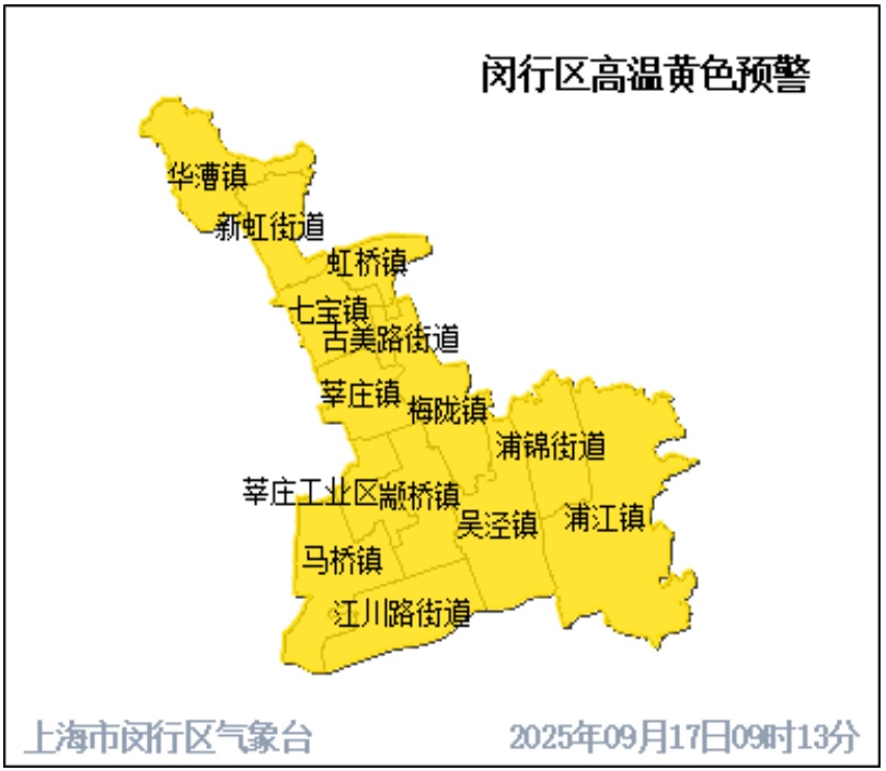 闵行预警发布中心2025年9月17日9时13分发布高温黄色预警信号: