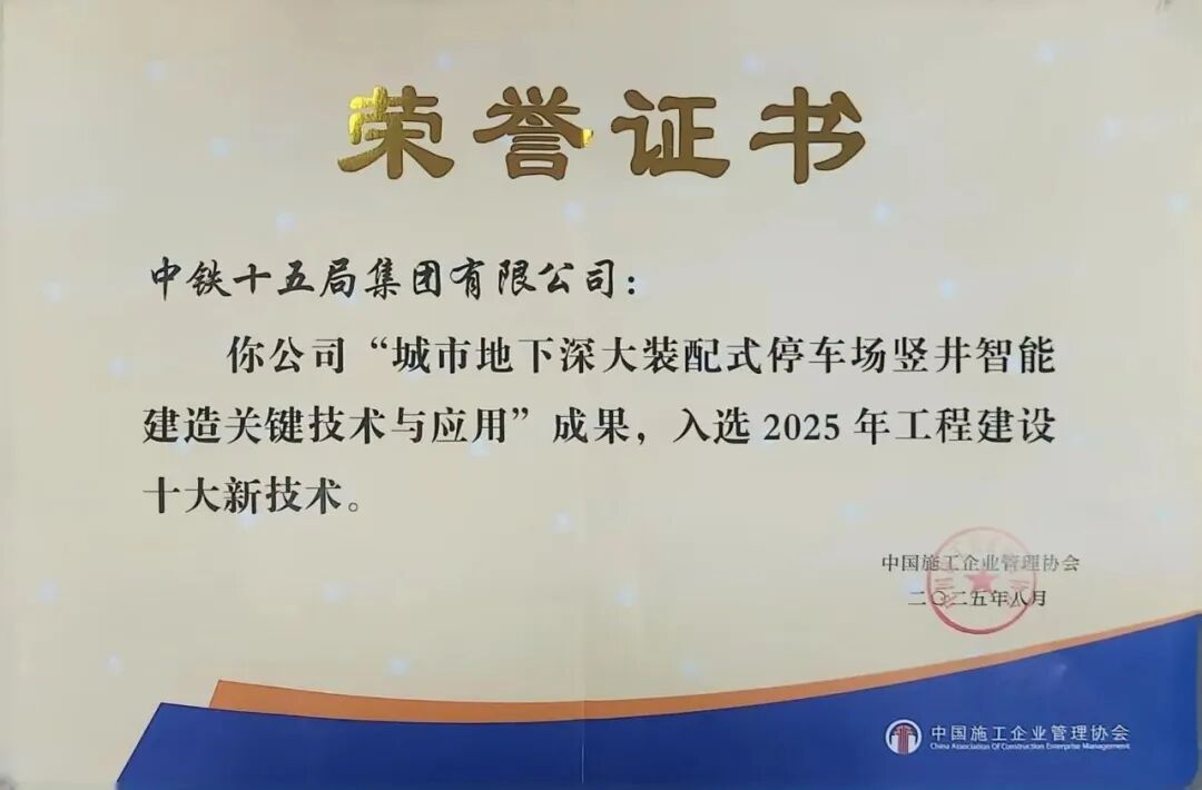 近日,中国施工企业管理协会公布“2025年工程建设十大新技术”名单,由中铁十五局集团有限公司联合中铁十五局集团地下工程有限公司、中铁建(上海)智慧交通科技有限公司共同研发的 “城市地下深大装配式停车场竖井智能建造关键技术与应用” 成功入选,标志着中铁十五局在城市地下空间开发智能建造领域取得重大突破,相关技术达到国际领先水平。