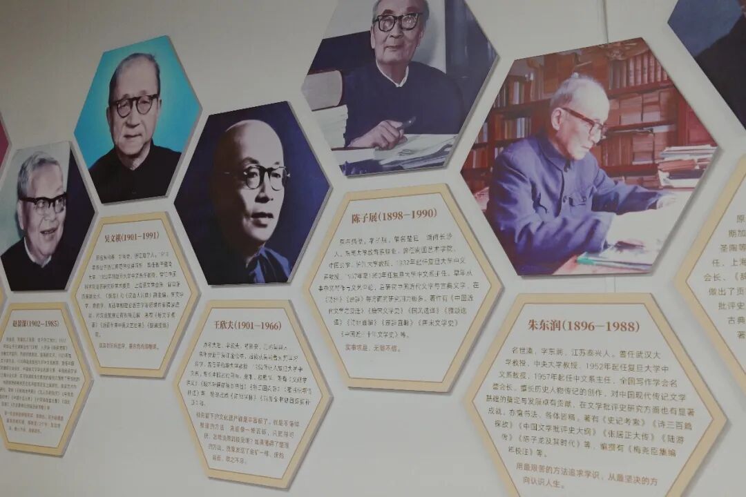 复旦中文系资料室墙上悬挂的中文系“十老”画像与介绍。最早由陈尚君提议,由章培恒先生、朱立元先生等排定,按年龄为序分别为陈望道、郭绍虞、朱东润、陈子展、吴文祺、王欣夫、赵景深、张世禄、蒋天枢、刘大杰,后有扩增。