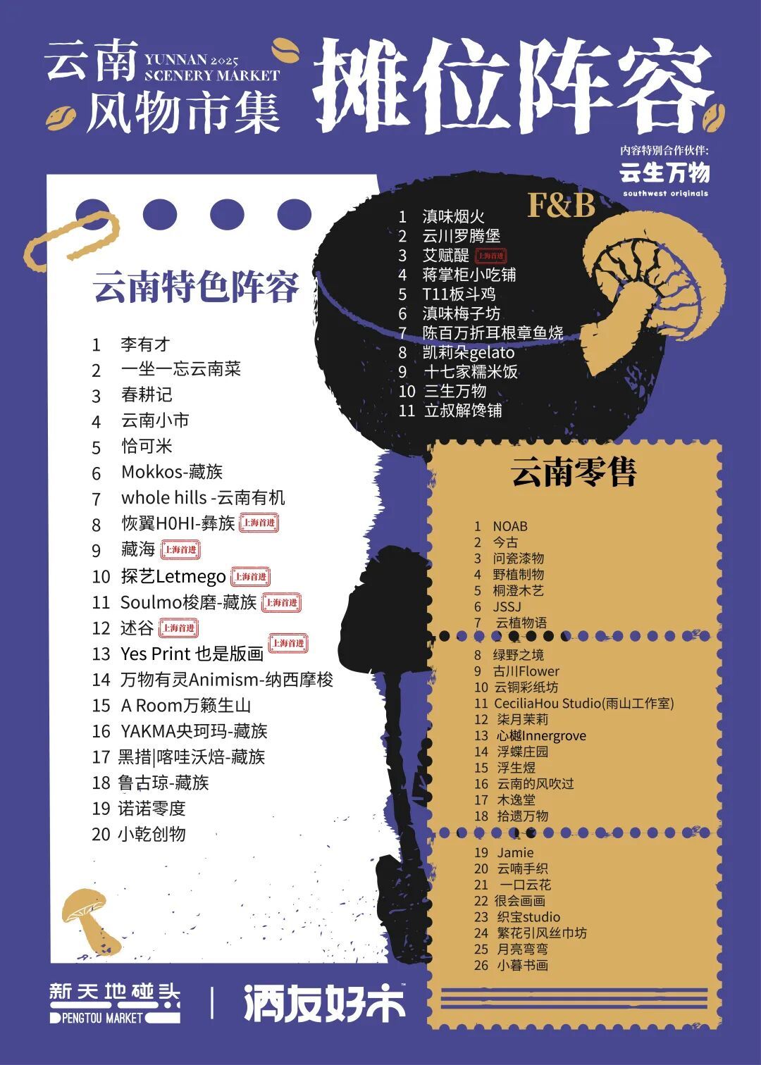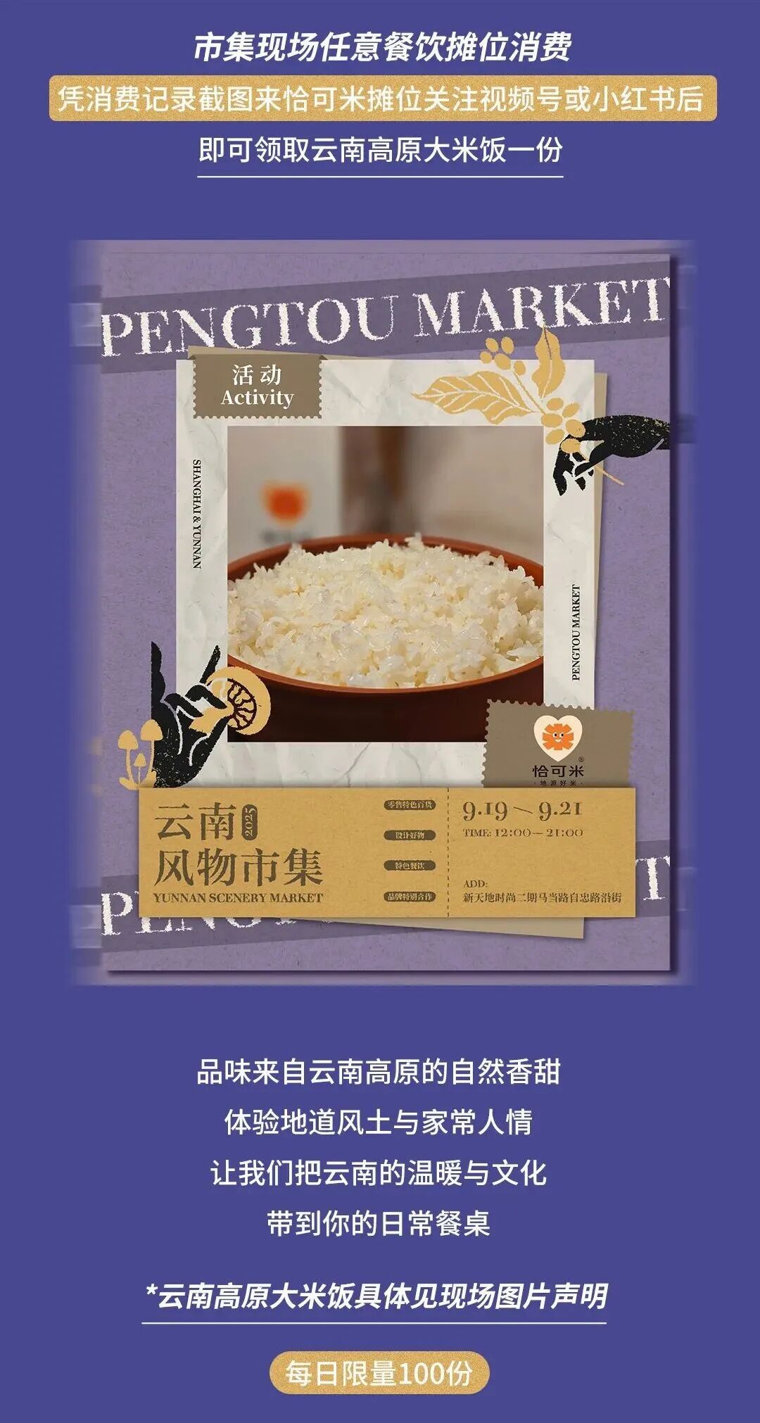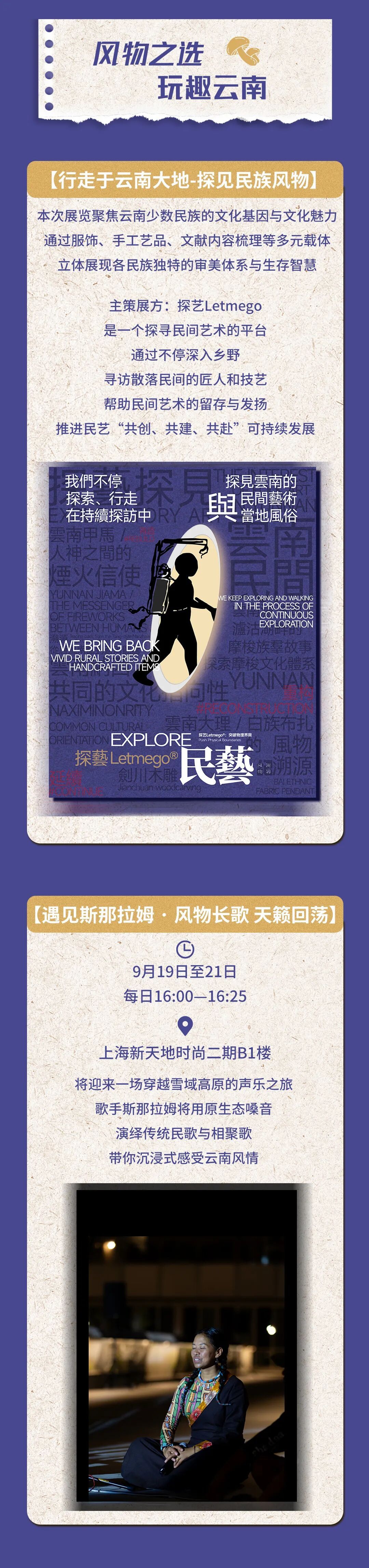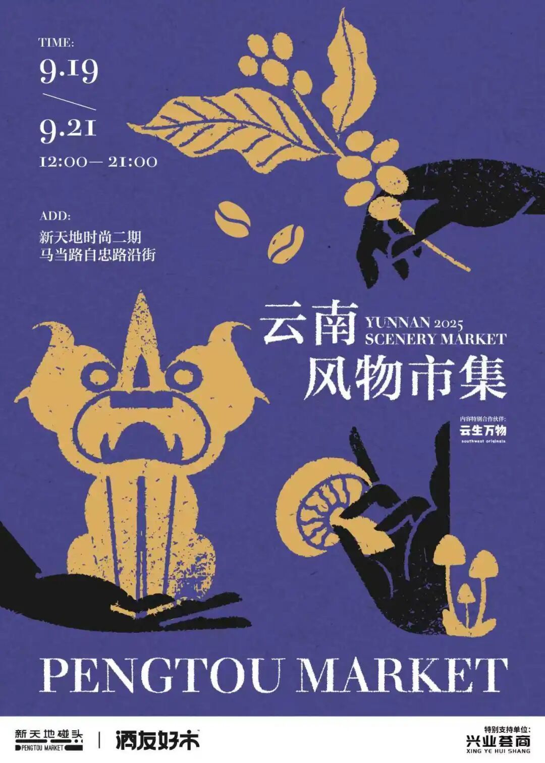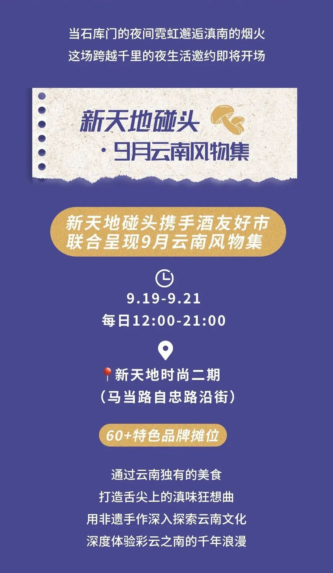 今天让我们一起走近新天地云南风物市集,9月19日至9月21日12:00-21:00,新天地时尚二期汇集60+云南特色品牌摊位,通过云南独有的美食,打造舌尖上的滇味狂想曲,用非遗手作深入探索云南文化,深度体验彩云之南的千年浪漫。
