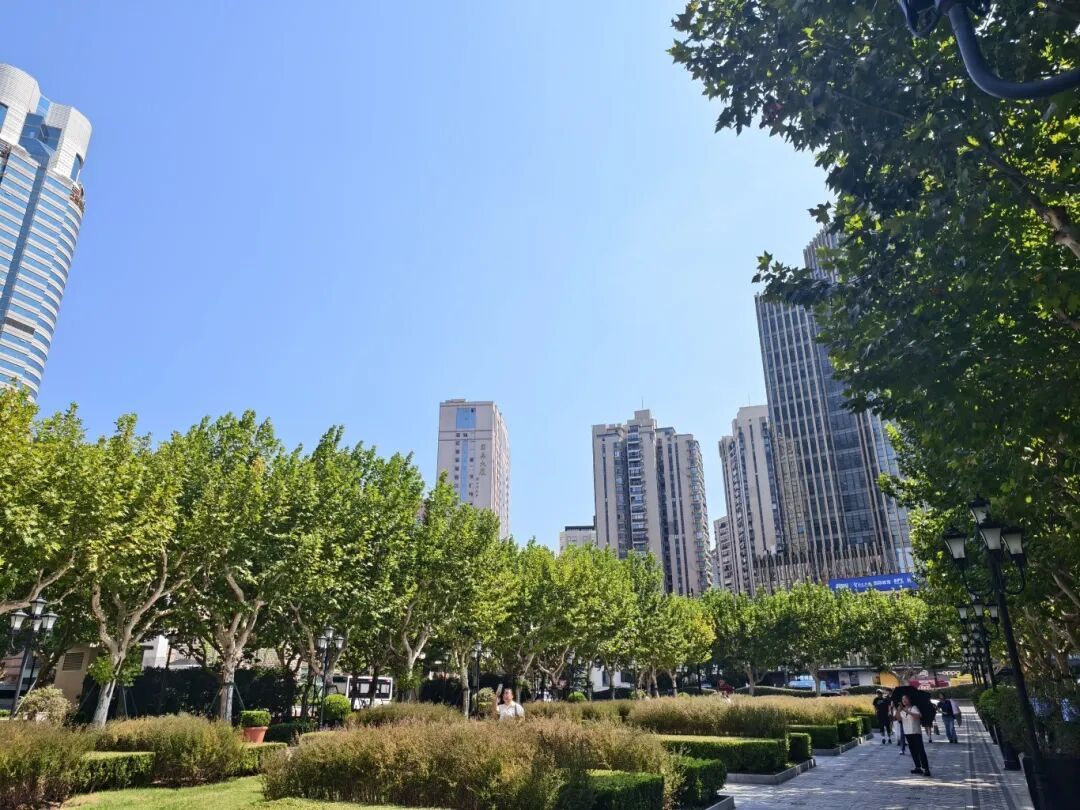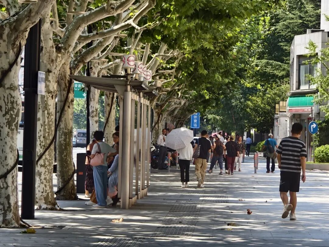 上午十点,徐家汇书院广场人来人往,不少游客手持遮阳伞,戴着遮阳帽、太阳镜“全副武装”来此打卡。