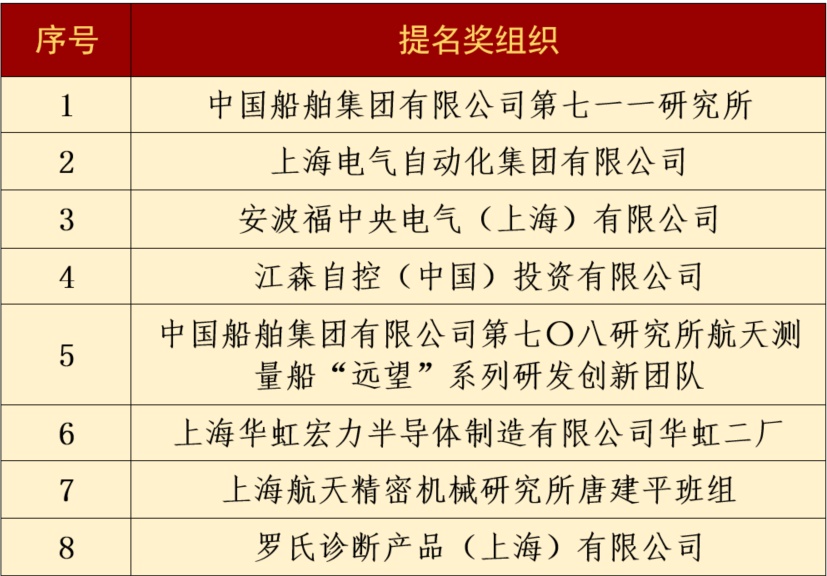 9月16日,中国质量(南京)大会隆重举办,会上公布了第五届中国质量奖评选结果,共评选出9家组织荣获中国质量奖,78家组织、6名个人荣获中国质量奖提名奖,上海市此次共有8家组织获得中国质量奖提名奖(详见下表)。