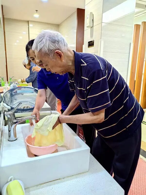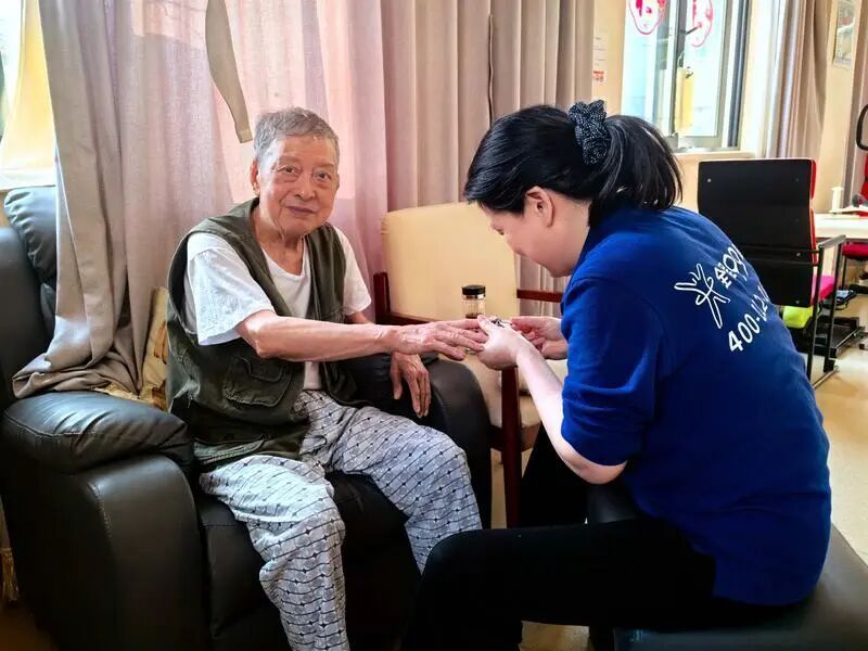 在这里,吴阿婆也从照顾者变成了被照顾者。老两口不再为一日三餐苦恼,到了用餐时间,只要在餐桌前坐下,工作人员就会把营养均衡的餐食端到面前。这里24小时有护理人员值班,从早上起床洗漱开始,两位老人就被贴心关怀围绕,白天参与康复训练、手工课程,与其他老人聊天互动,和前来照护中心陪伴老人的志愿者互动,生活充实而愉快。