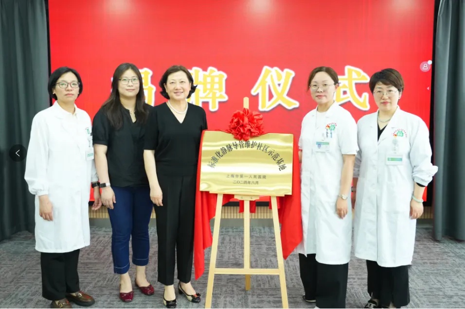 邢红(左三)为标准化静脉导管维护社区示范基地揭牌