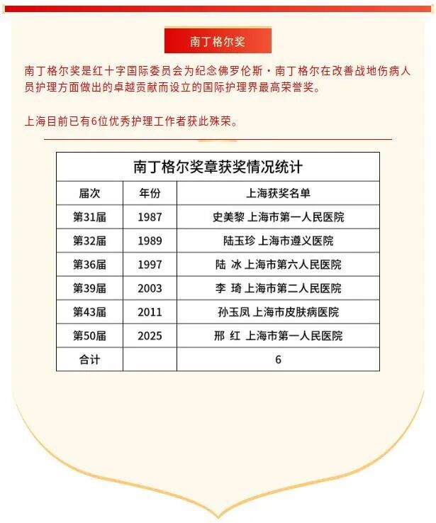 中国红十字会第50届南丁格尔奖颁奖活动日前在北京人民大会堂隆重举行,上海市第一人民医院主任护师邢红登台领奖。这也是上海时隔14年再次获此殊荣。
