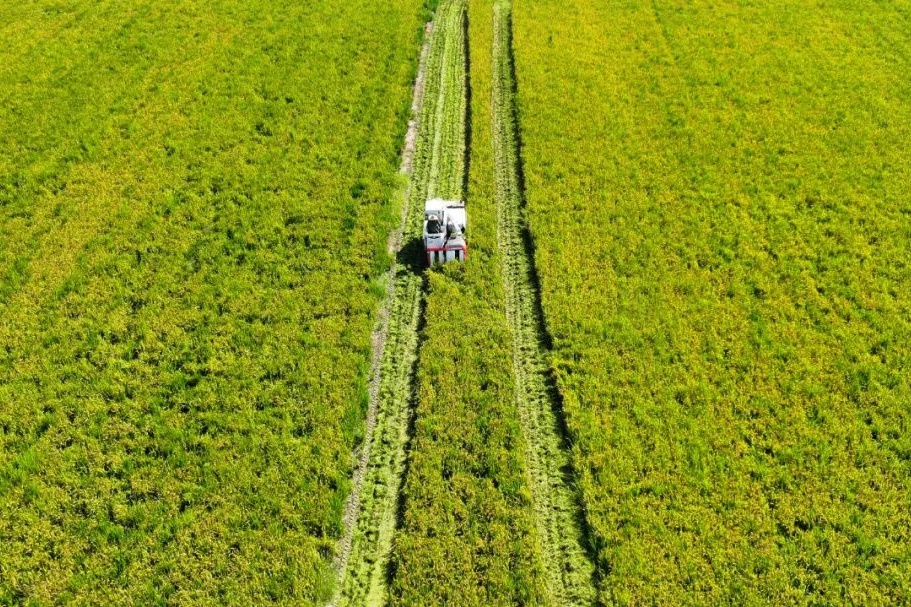 9月15日,奉贤区自主培育的早熟稻“美谷1号”在青村镇李窑村开镰,两台大型联合收割机同步作业,收割、脱粒、粉碎秸秆同步完成。据悉,新米预计将于本周六上市,为市民餐桌增添一份香甜。
