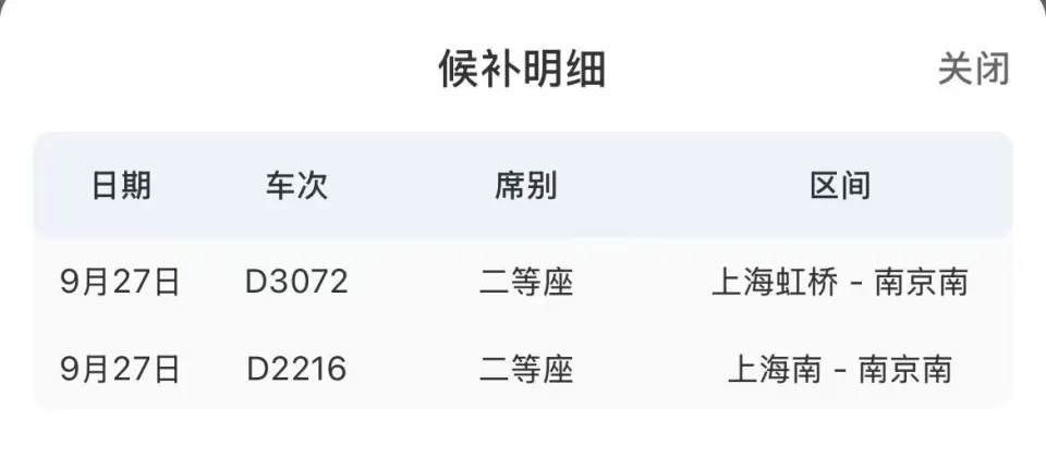3.添加更多候补车次后,在确认候补订单页面的最上方,可以查看全部候补车次信息,包括日期、车次、席别、区间。