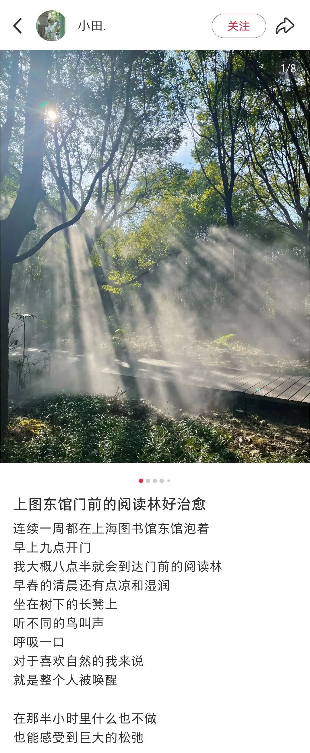小红书读者@小田.最爱开馆前的悦读森林!在雾气弥漫的早晨,用镜头捕捉到如梦似幻的“丁达尔效应”。