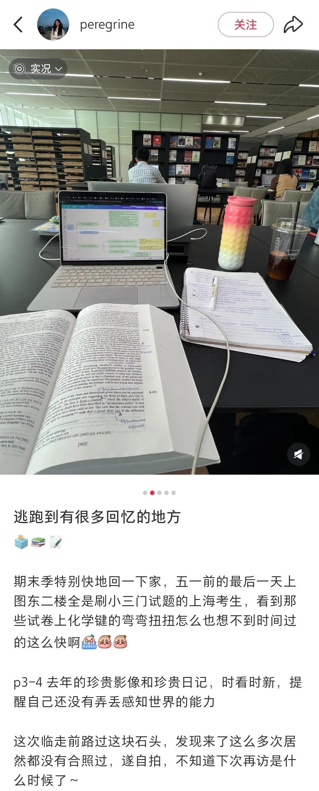 今年五一假期,小红书读者@peregrine作为上海考生,在东馆二楼狂刷小三门的试题。相册里去年在东馆自习的照片和日记也在提醒着自己:“我还没有弄丢感知世界的能力。”