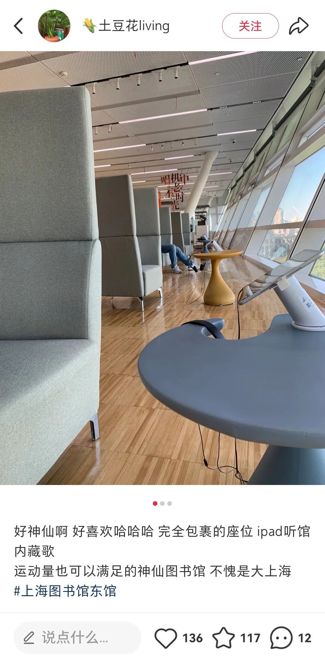 东馆五楼音乐馆的包裹式座位,让小红书读者@土豆花living 一秒爱上!还可以用ipad收听馆藏曲目哦。